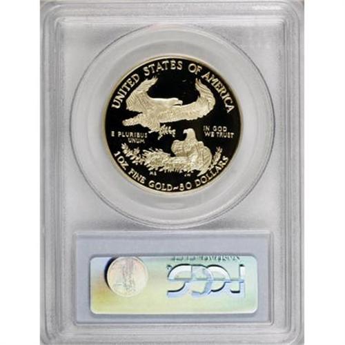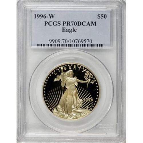 <B>1996-W G$50 One-Ounce Gold Eagle PR70 Deep Cameo PCGS.</B></I> PCGS Population (38/0). NGC Census: (266/0). Numismedia Wsl. Price for NGC/PCGS coin in PR70: $1,800. (#9909)<BR><BR><b>Shipping:</b> Coins & Currency (<a target="_blank" href="http://www.heritageauctions.com/common/shipping.php">view shipping information</a>)