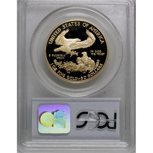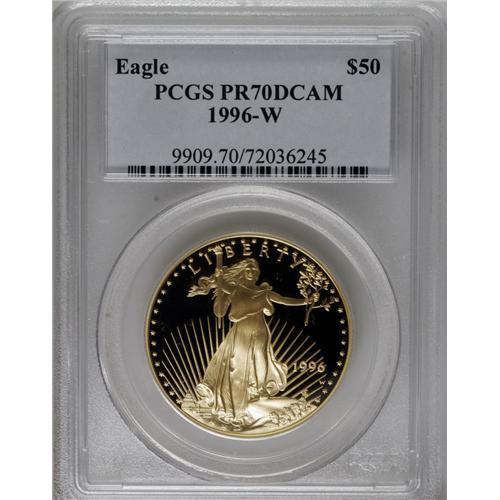 <B>1996-W G$50 One-Ounce Gold Eagle PR70 Deep Cameo PCGS.</B></I> A blazing yellow-gold modern with exceptional contrast and a hint of orange on the obverse. PCGS has assigned this grade to just 28 specimens (2/07).<BR><BR><b>Shipping:</b> Coins & Currency (<a target="_blank" href="http://www.heritageauctions.com/common/shipping.php">view shipping information</a>)