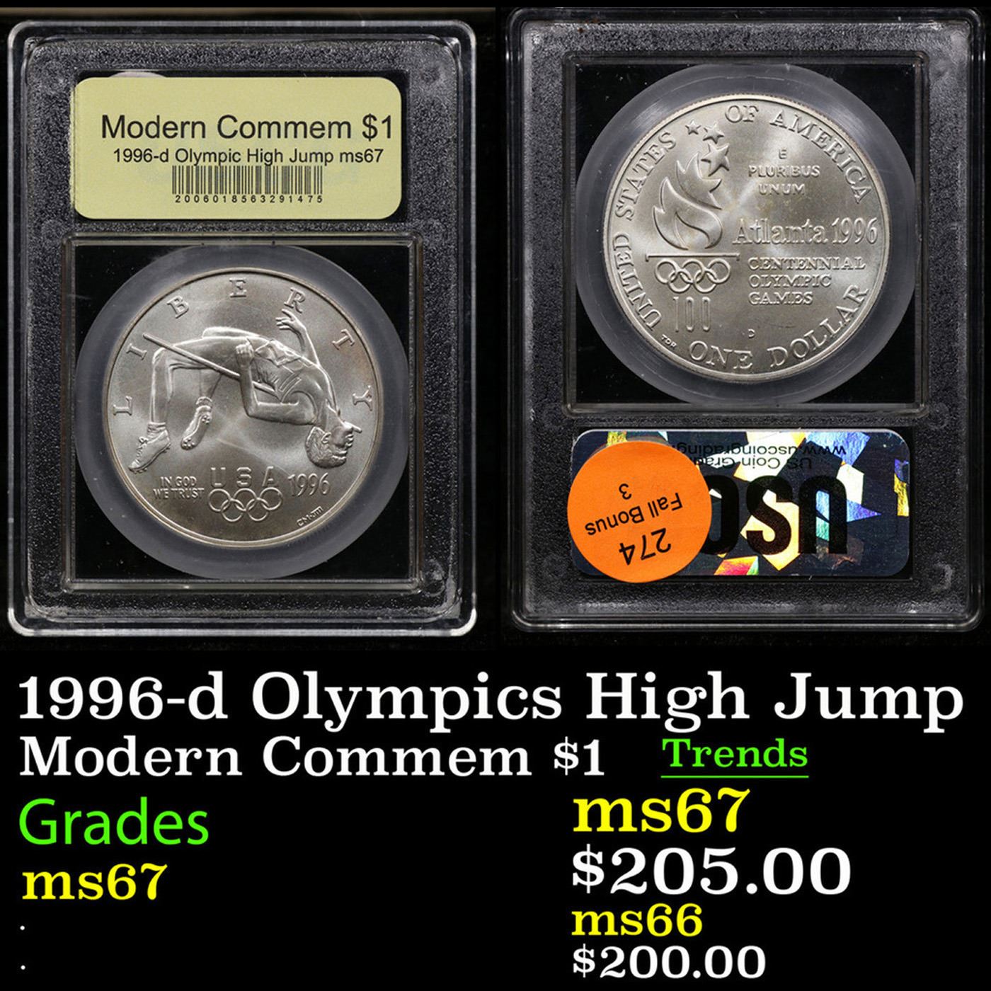 1996-d Olympics High Jump Modern Commem Dollar $1 Graded ms67 By USCG. The 1996 Olympic High Jump Dollar was issued as part of an extensive program of commemorative coins for the XXVI Olympiad held in Atlanta, Georgia. There were a total of sixteen different coins issued for the program over the course of two years.