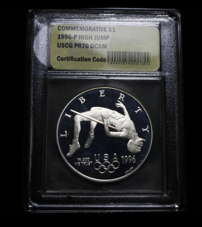 The 1996 Olympic High Jump Silver Dollar was issued was part of an extensive program of commemorative coins for the XXVI Olympiad held in Atlanta, Georgia. There were a total of sixteen different coins issued for the program over the course of two years. Estimated Value $400.