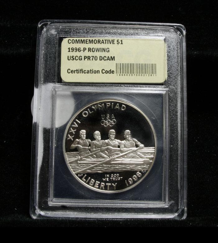 The 1996 Olympic Rowing Silver Dollar was issued was part of an extensive program of commemorative coins for the XXVI Olympiad held in Atlanta, Georgia. There were a total of sixteen different coins issued for the program over the course of two years. PCGS lists PR70 DCAM as $2500, elusive. This Perfect coin is graded PR70 Deep cameo by USCG. Estimated Value $400.
