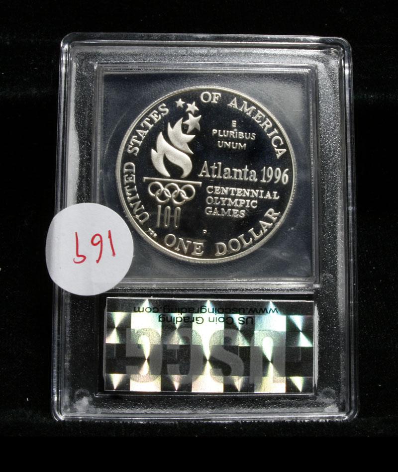The 1996 Olympic Rowing Silver Dollar was issued was part of an extensive program of commemorative coins for the XXVI Olympiad held in Atlanta, Georgia. There were a total of sixteen different coins issued for the program over the course of two years. PCGS lists PR70 DCAM as $2500, elusive. This Perfect coin is graded PR70 Deep cameo by USCG. Estimated Value $400.