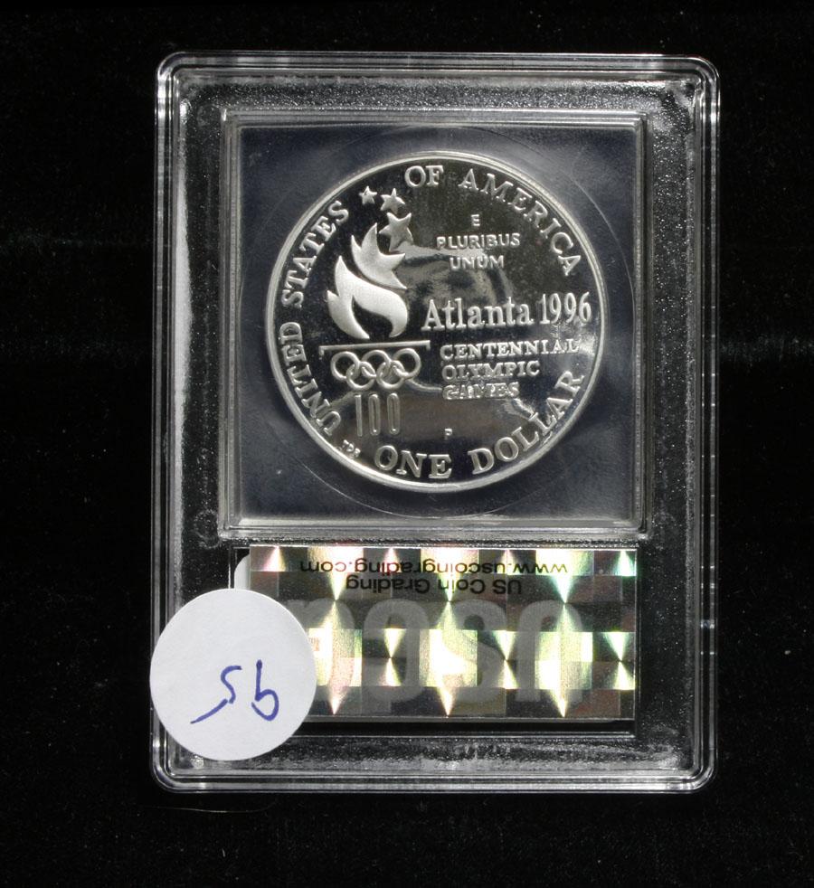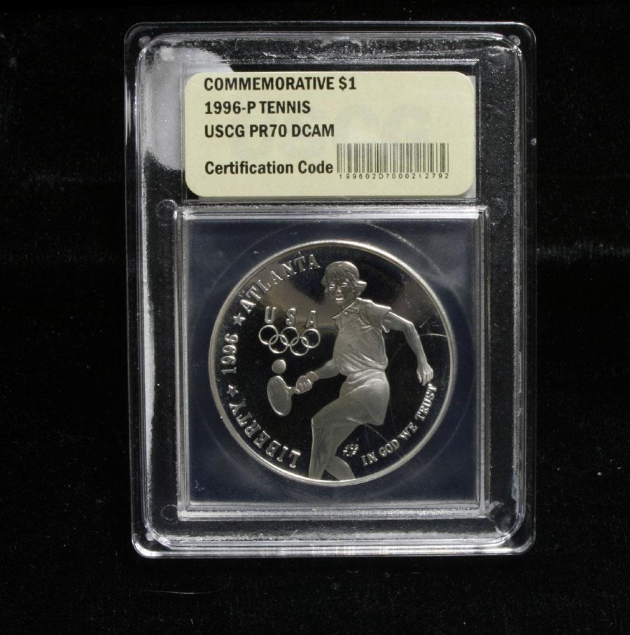 Note* The white or lighter areas in the image are a reflection in the mirrored Fields, sorry, bad angle on the photograph. The 1996 Olympic Tennis Silver Dollar was issued was part of an extensive program of commemorative coins for the XXVI Olympiad held in Atlanta, Georgia. There were a total of sixteen different coins issued for the program over the course of two years. PCGS lists PR70 DCAM as elusive. This Perfect coin is graded PR70 Deep cameo by USCG. Estimated Value $500.
