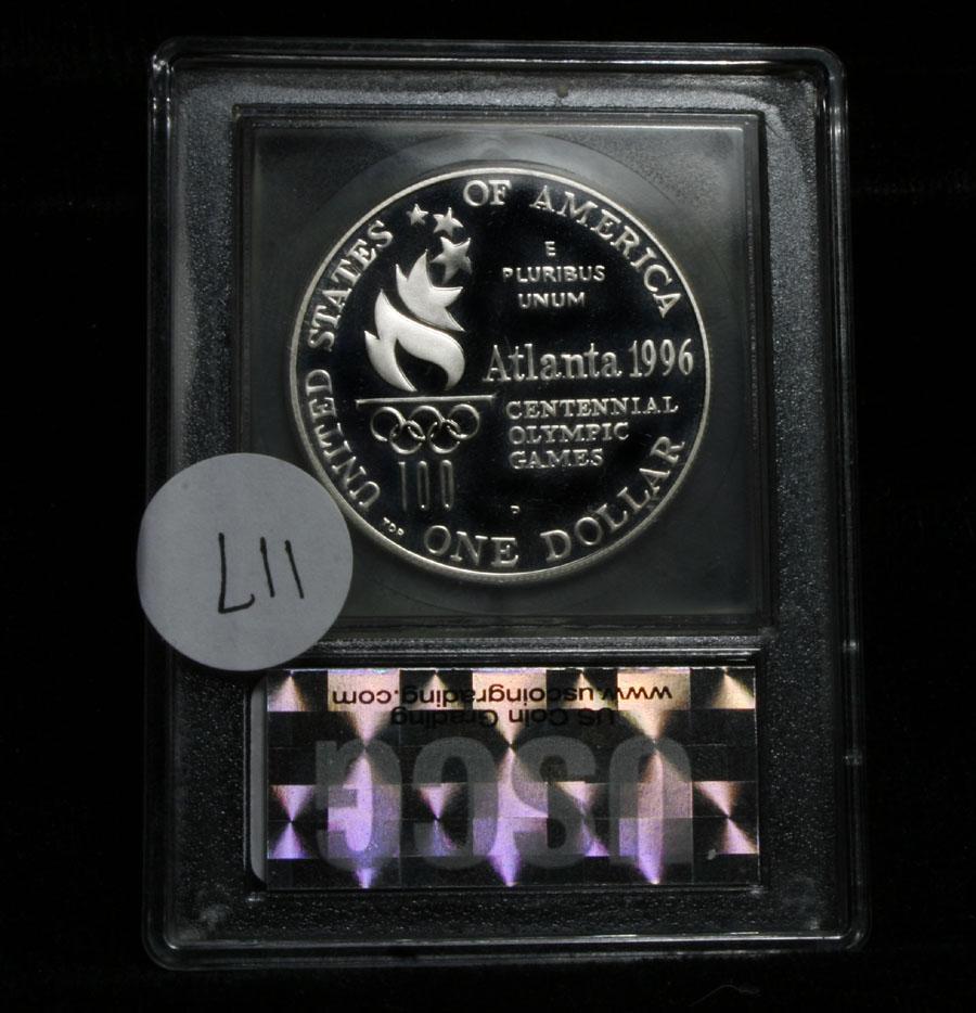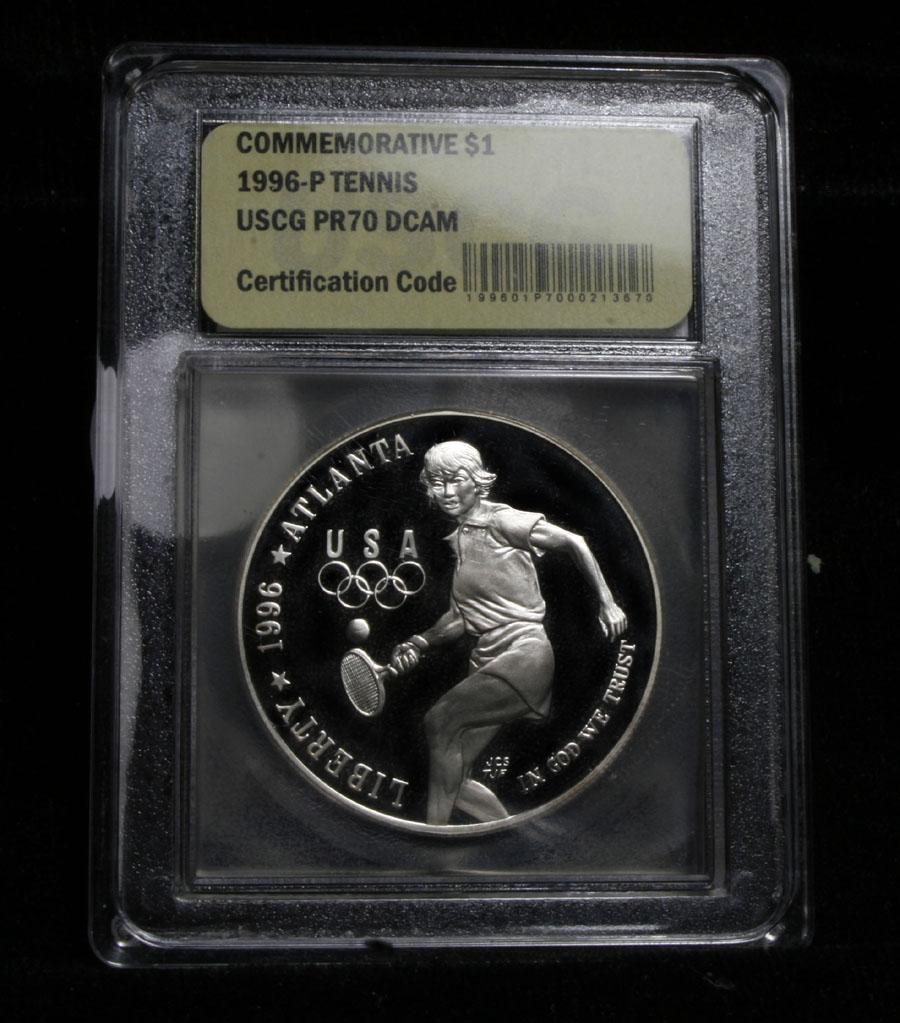 The 1996 Olympic Tennis Silver Dollar was issued was part of an extensive program of commemorative coins for the XXVI Olympiad held in Atlanta, Georgia. There were a total of sixteen different coins issued for the program over the course of two years.  PCGS lists PR70 DCAM as elusive.  This Perfect coin is graded PR70 Deep cameo by USCG.  Estimated Value $250.