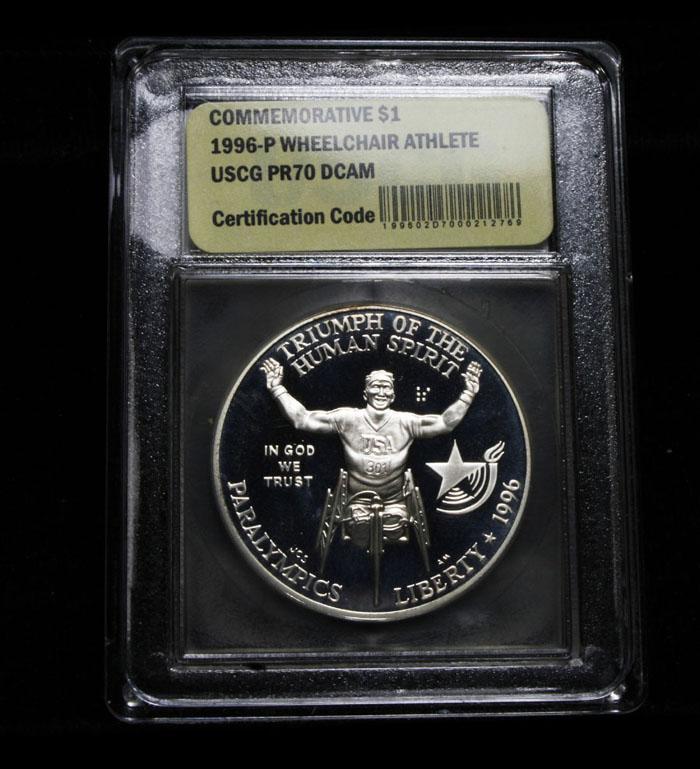 The 1996 Paralympics Silver Dollar was issued was part of an extensive program of commemorative coins for the XXVI Olympiad held in Atlanta, Georgia. There were a total of sixteen different coins issued for the program over the course of two years. PCGS have graded 0 as PR70 DCAM The list PR69 at $115.. This Perfect coin is graded PR70 Deep cameo by USCG. Estimated Value $350.