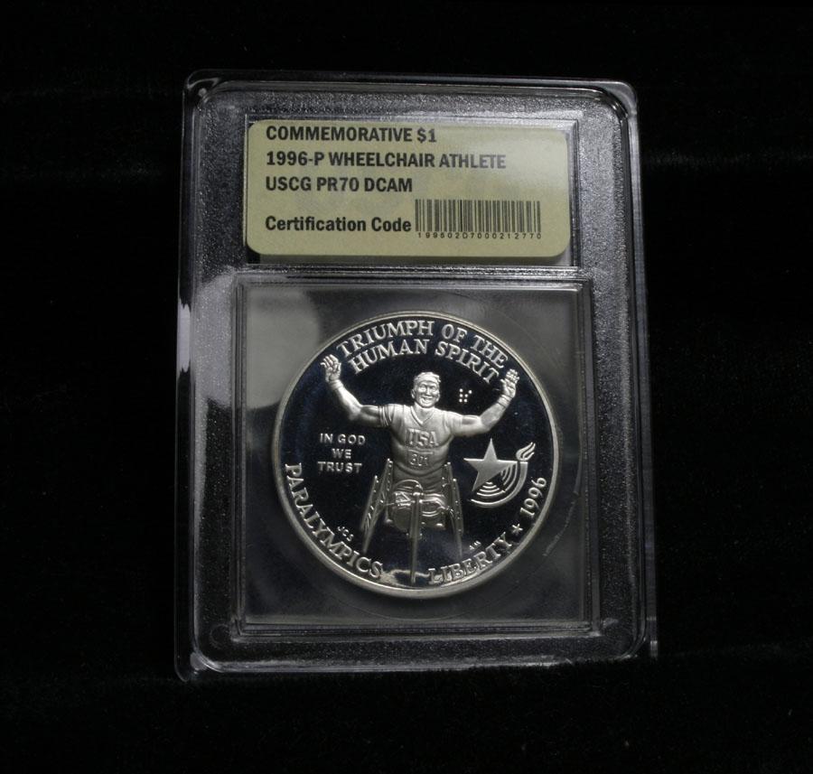The 1996 Paralympics Silver Dollar was issued was part of an extensive program of commemorative coins for the XXVI Olympiad held in Atlanta, Georgia. There were a total of sixteen different coins issued for the program over the course of two years. This Perfect coin is graded PR70 Deep cameo by USCG. Estimated Value $350.