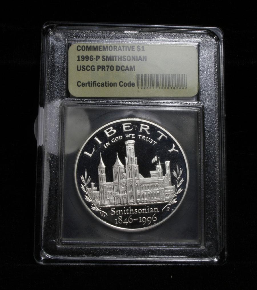 The 1996 Smithsonian 150th Anniversary Silver Dollar was issued to commemorate the establishment of the Smithsonian Institution by Congress on August 10, 1846. Encapsulated and graded PF70 DCAM by USCG. PCGS list PR70 DCAM at $3000. Estimated Value $400