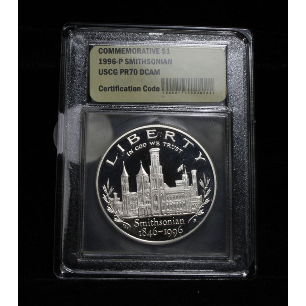 The 1996 Smithsonian 150th Anniversary Silver Dollar was issued to commemorate the establishment of the Smithsonian Institution by Congress on August 10, 1846. Encapsulated and graded PF70 DCAM by USCG. PCGS list PR70 DCAM at $3000. Estimated Value $400