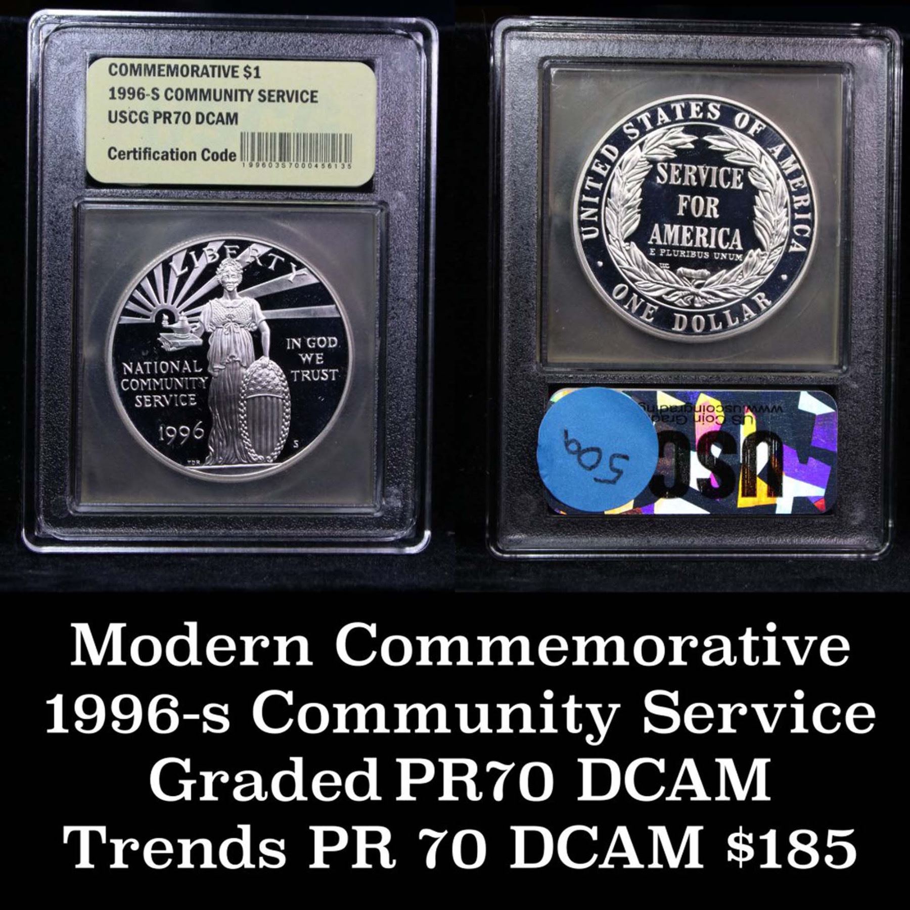 1996-s Community Service Proof Modern Commem Dollar $1 Graded GEM++ Proof Deep Cameo by USCG. The 1996 National Community Service Silver Dollar was issued to honor the spirit of volunteerism in the United States. This example has been Encapsulated and Graded perfection, Gem++ proof DCAM by USCG.