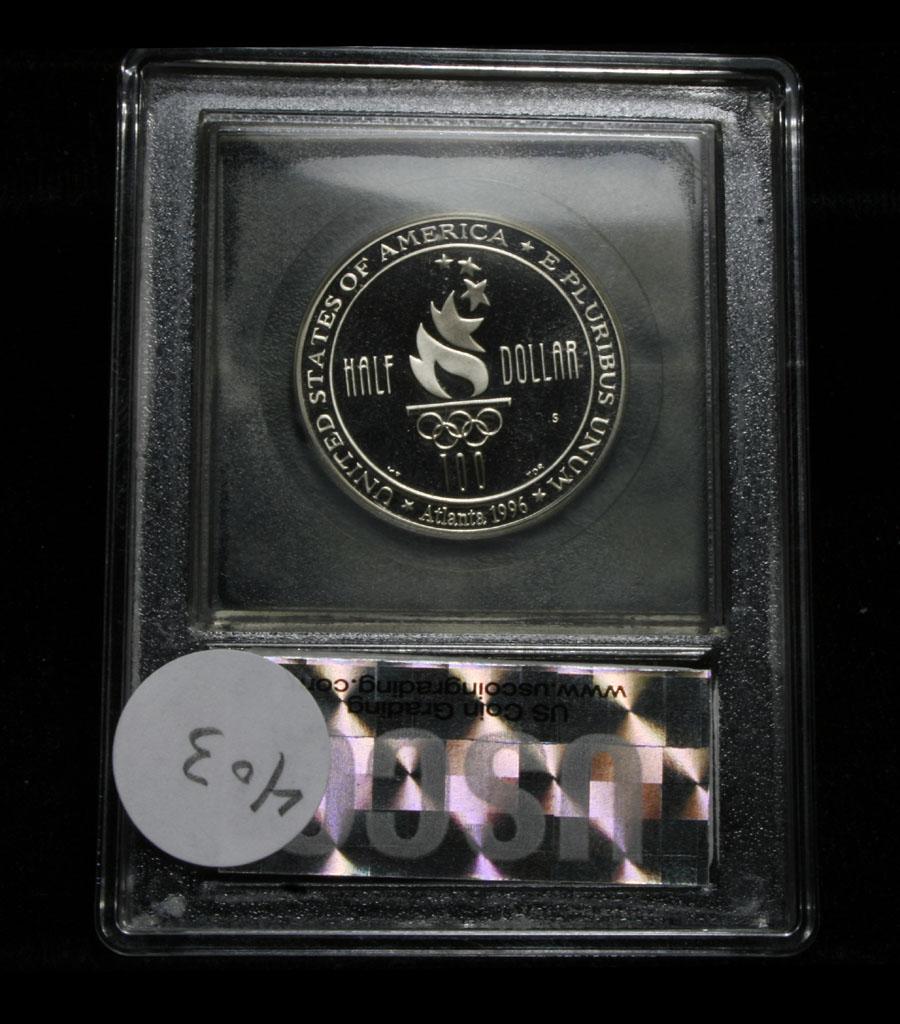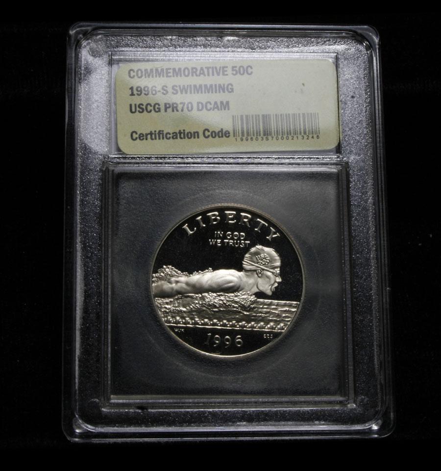 The 1996 Olympic Swimming 50c was issued as part of a program of commemorative coins for the XXVI Olympics held in Atlanta. There were a total of sixteen different coins issued for the program over the course of two years. PCGS lists PR70 DCAM as $2250, Elusive. This Perfect coin is graded PR70 Deep cameo by USCG. Estimated Value $400.