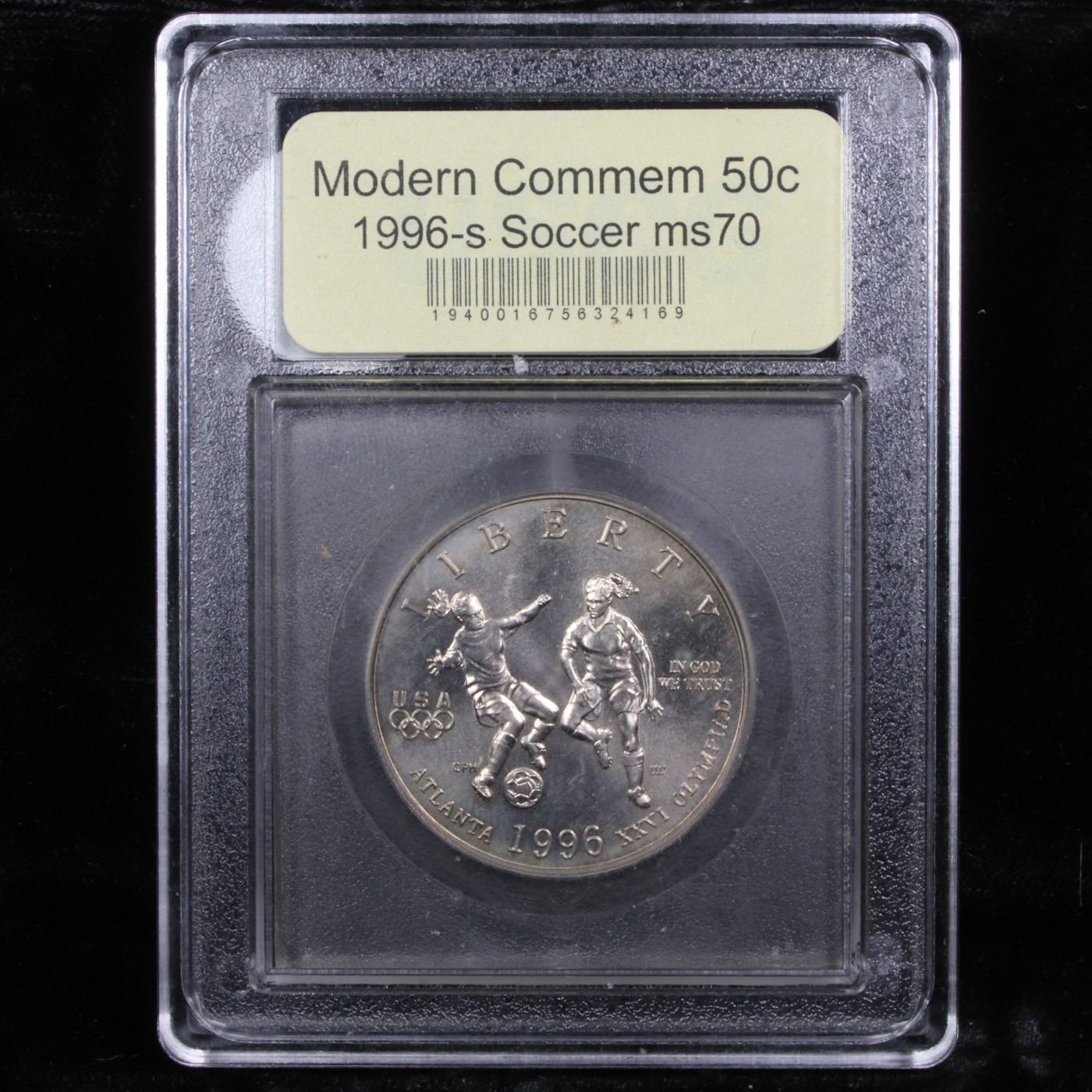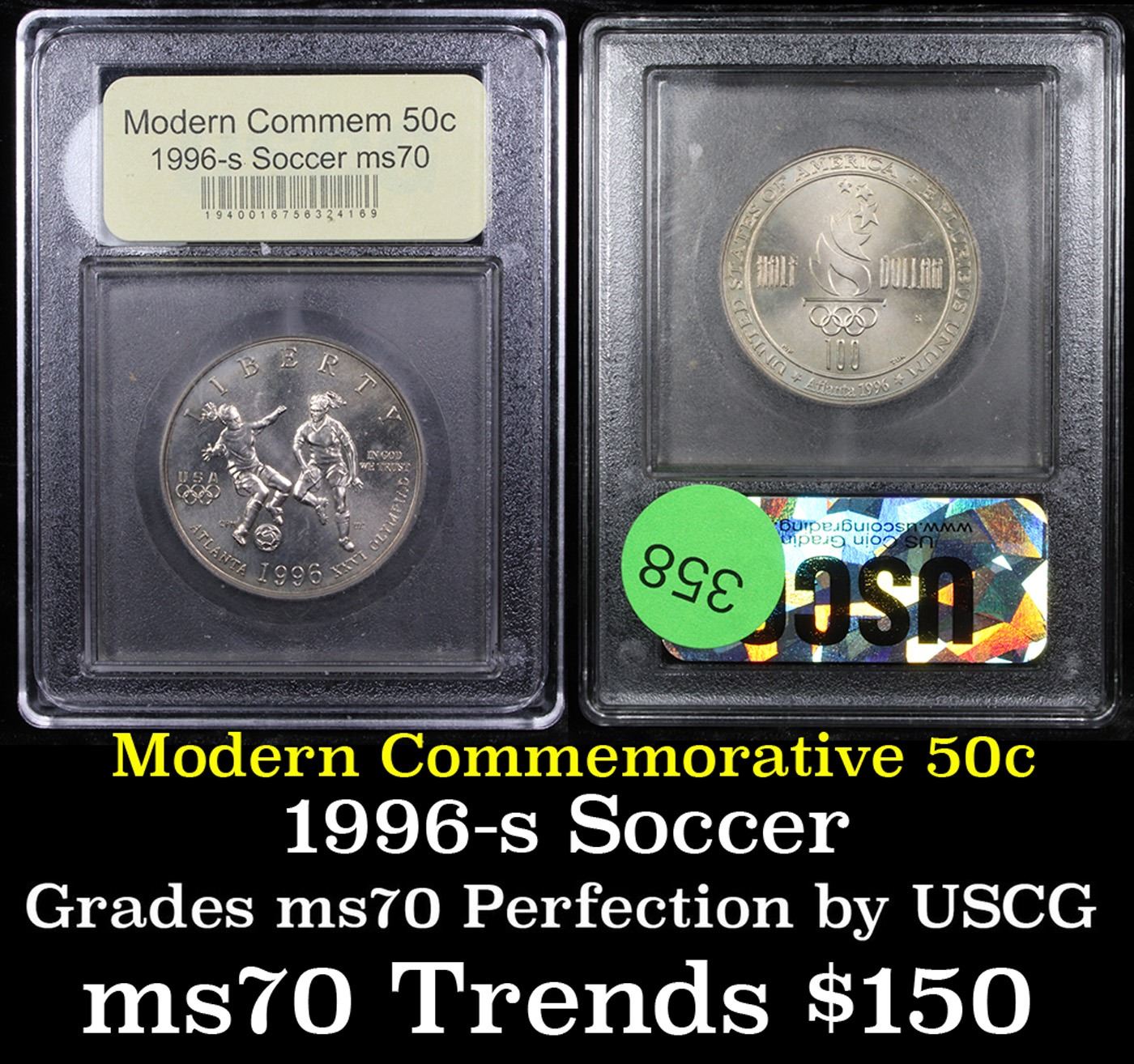 1996-s Olympics Soccer Modern Commem Half Dollar 50c Graded ms70, Perfection By USCG. The 1996 Olympic Soccer Half Dollar was issued was part of an extensive program of commemorative coins for the XXVI Olympiad held in Atlanta, Georgia. There were a total of sixteen different coins issued for the program over the course of two years. This Perfect coin is graded PR70 Deep cameo by USCG.