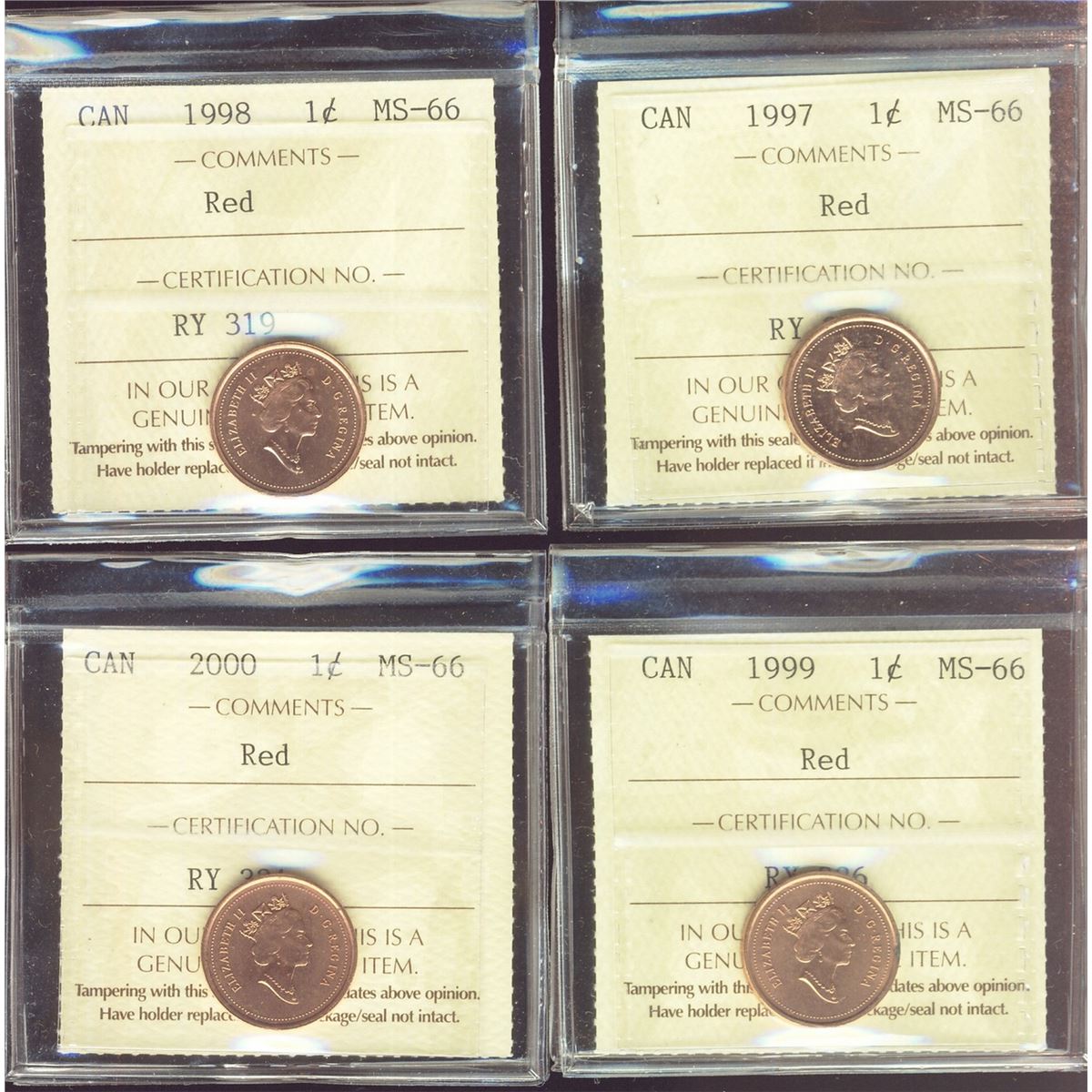 1997 1¢, 1998, 1999 & 2000 ICCS MS66RD. Lot of 4 coins.