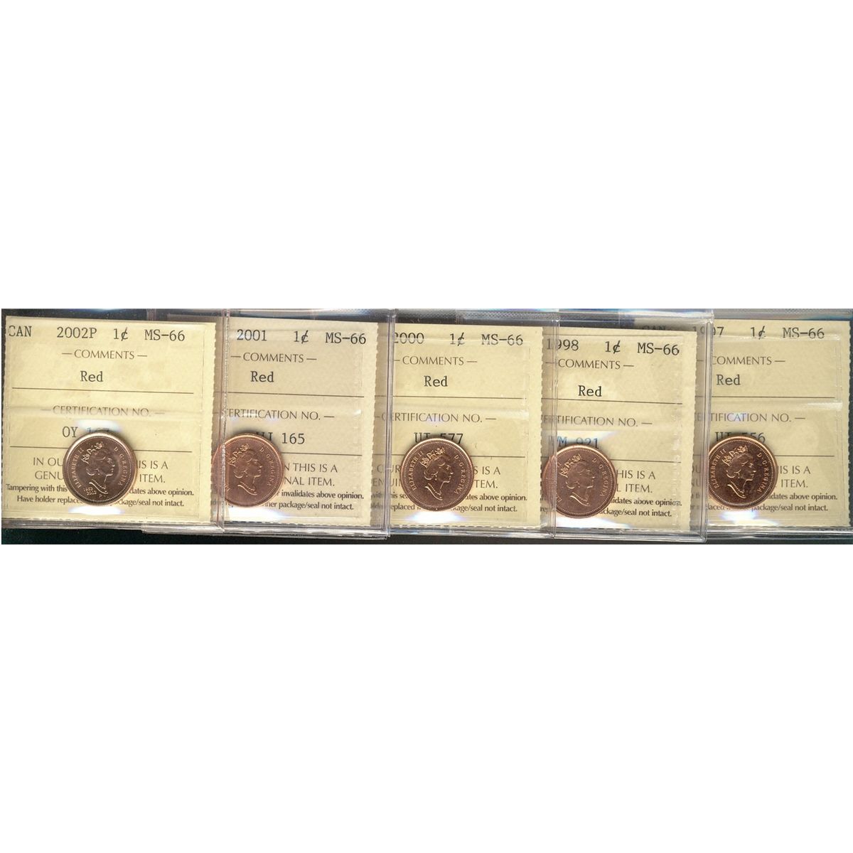 1997 1¢, 1998, 2000, 2001 & 2002P ICCS MS66. Lot of 5 coins.