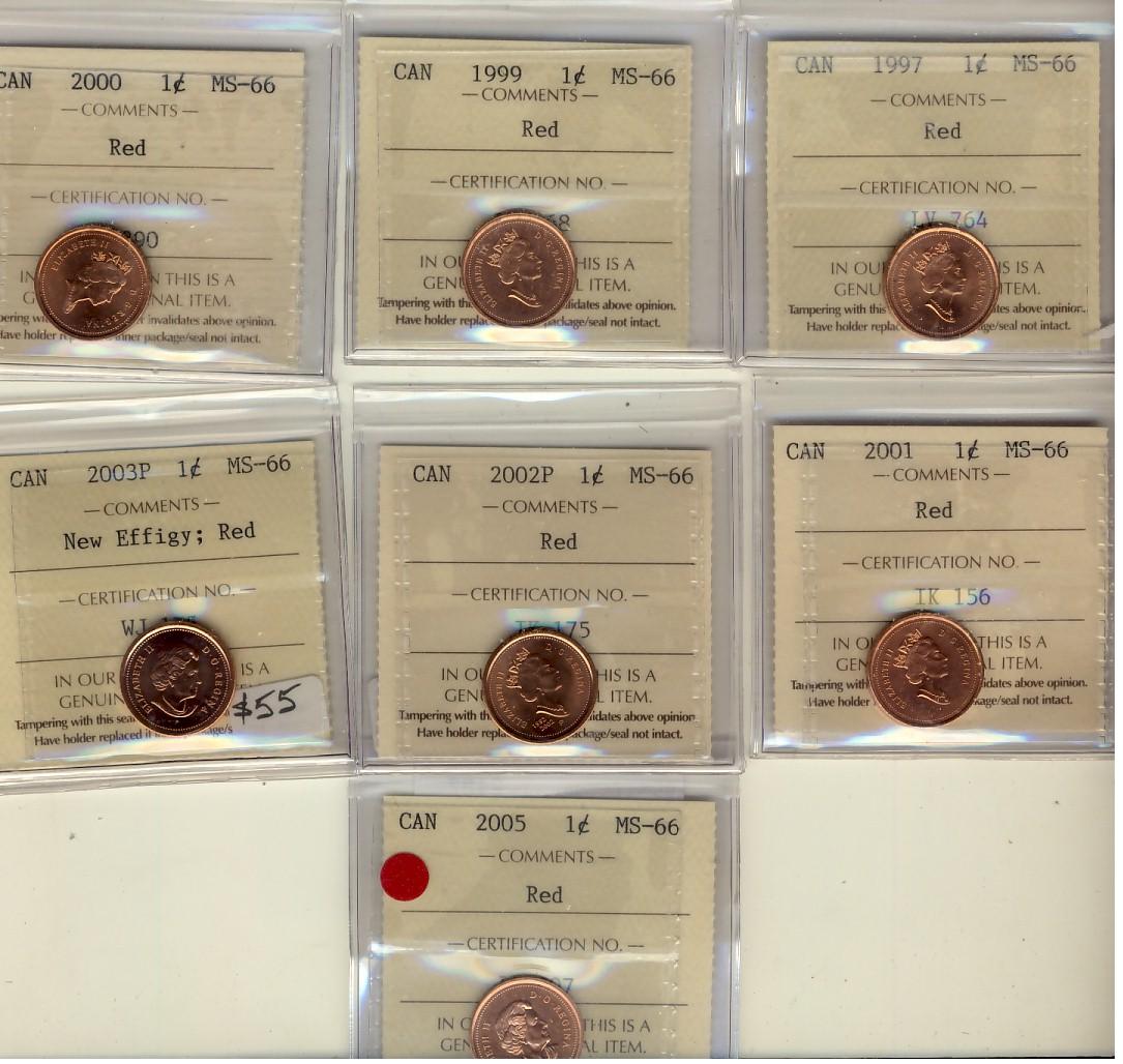1997 1¢, 1999, 2000, 2001, 2002P, 2003P New Effigy & 2005 ICCS MS66. Lot of 7 coins.