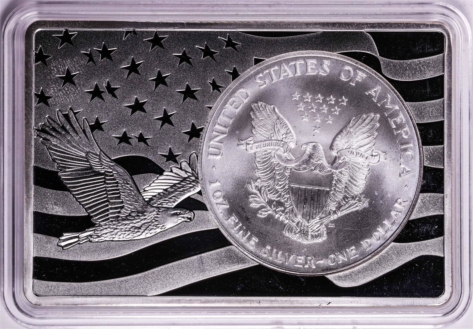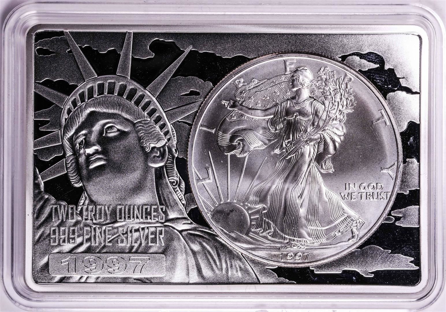 One 1997 $1 American Silver Eagle Coin & 2oz Silver Bar Set.