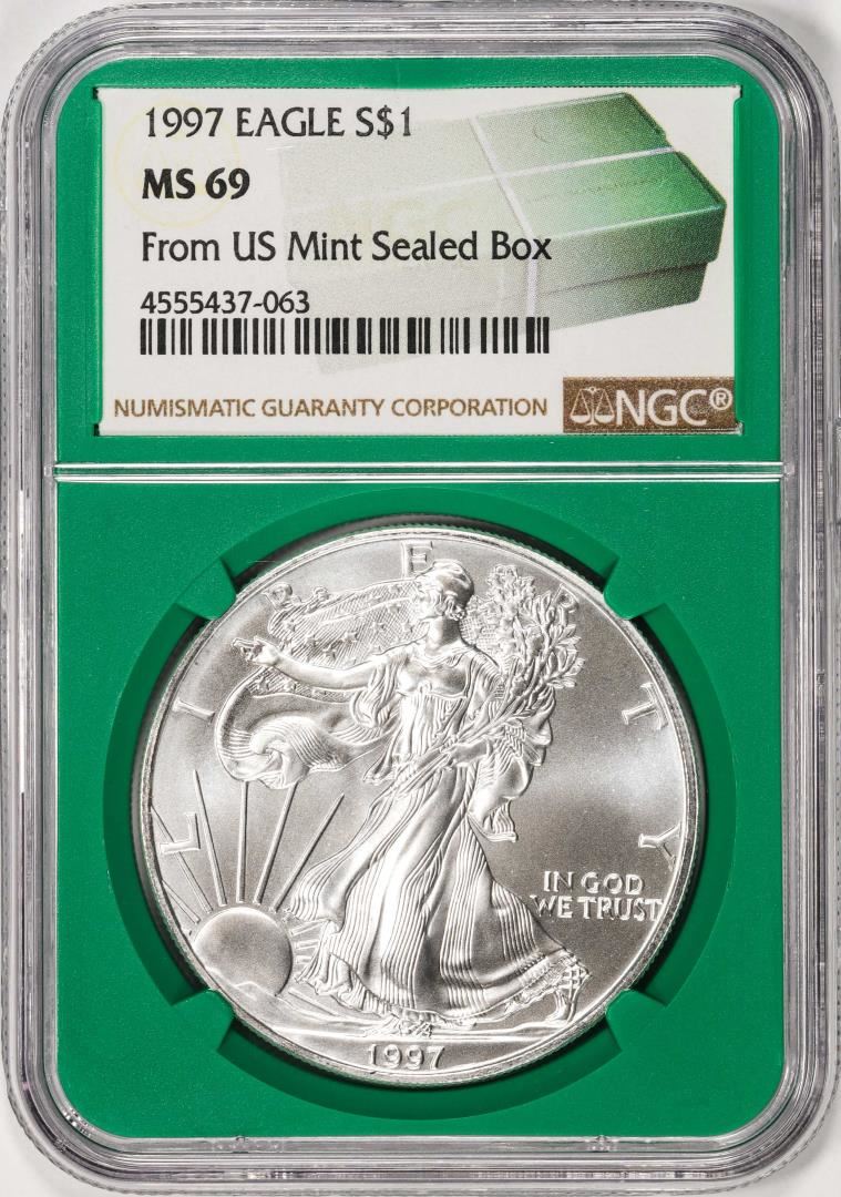 One 1997 $1 American Silver Eagle Coin NGC MS69 Green Core. NGC Certified.