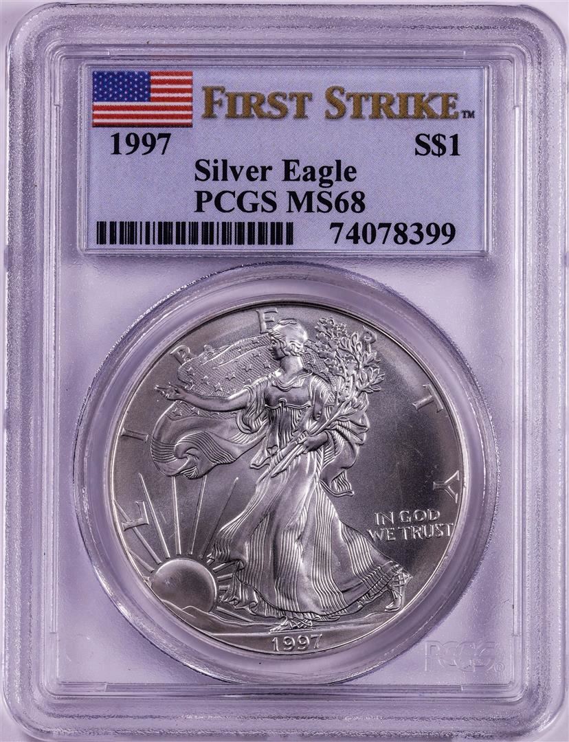 One 1997 $1 American Silver Eagle Coin PCGS MS68 First Strike. PCGS Graded.