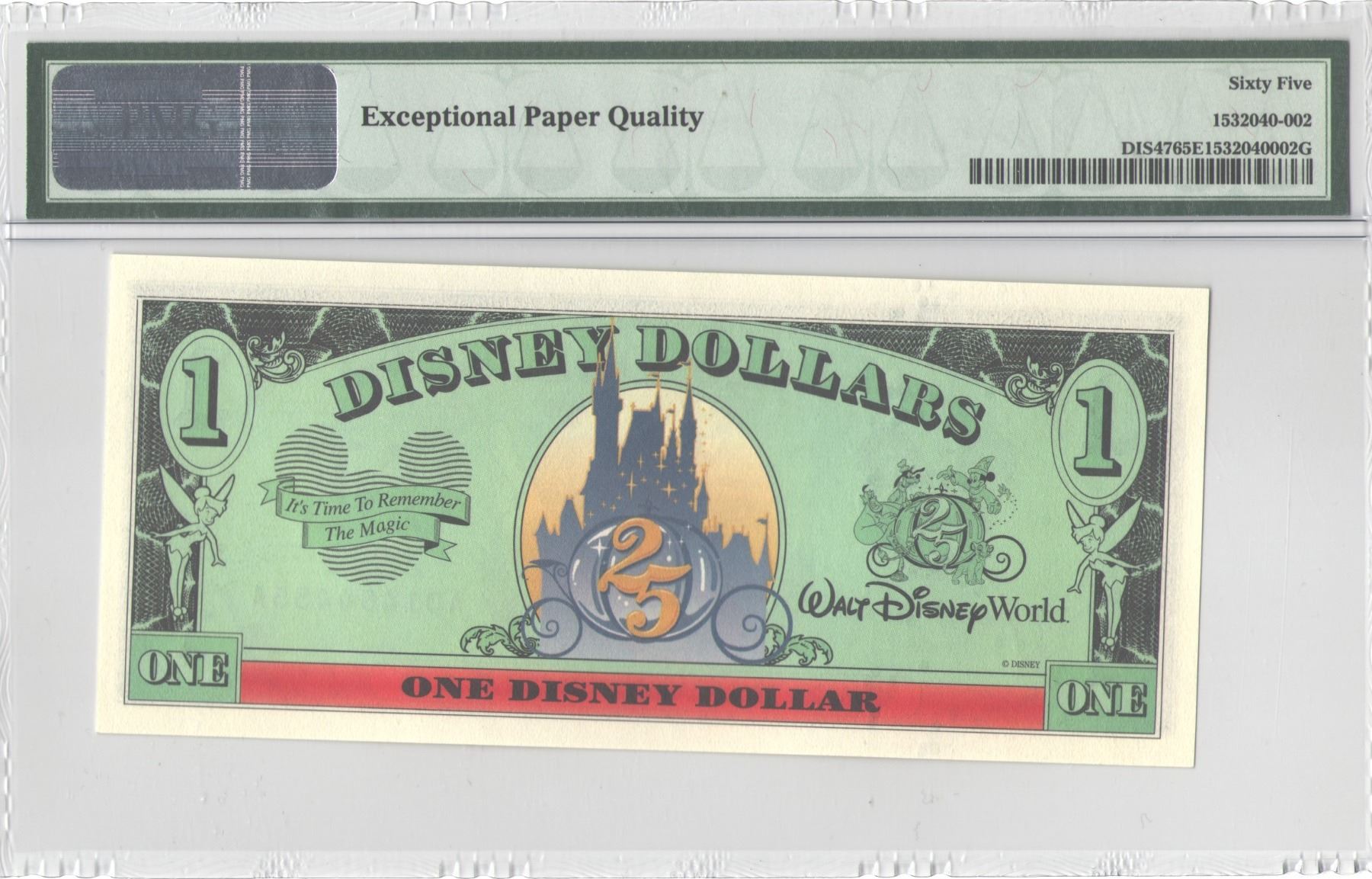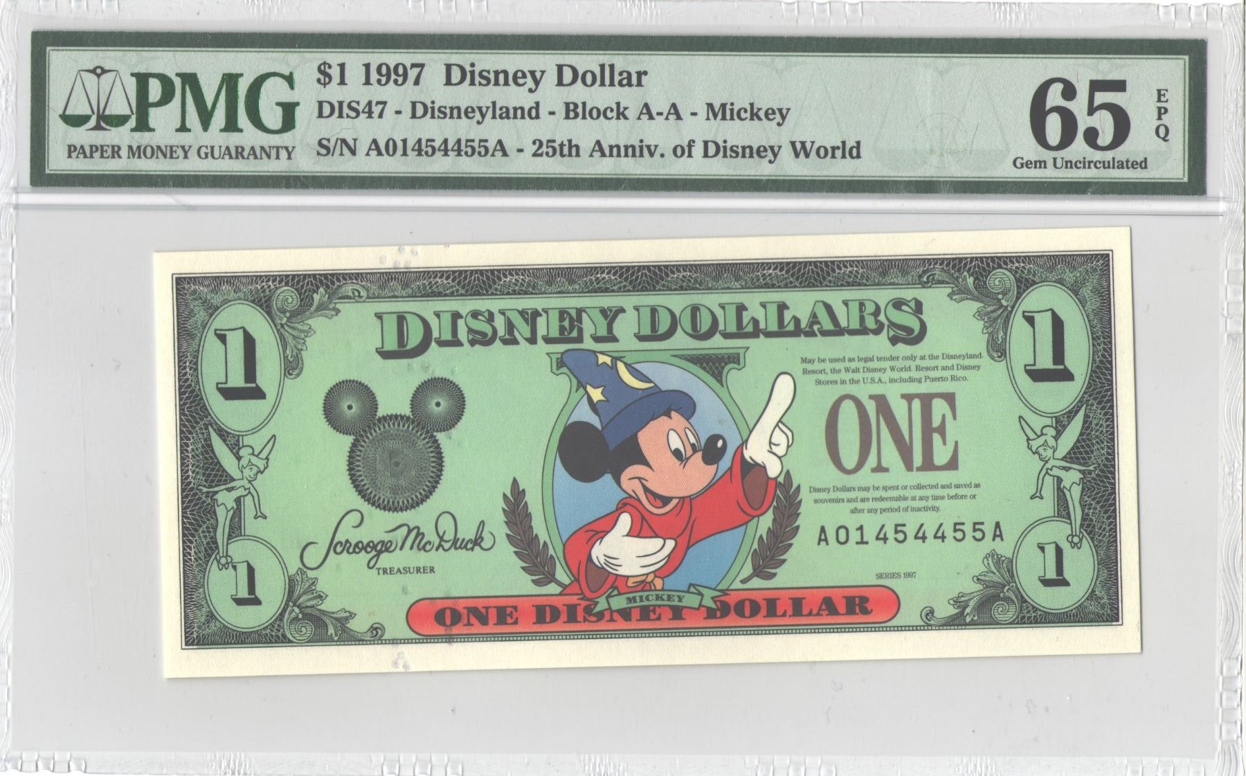 One 1997 $1 Disney 25th Anniversary Mickey the Sorcerer Note PMG 65EPQ.