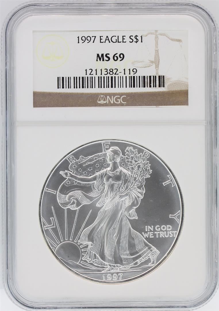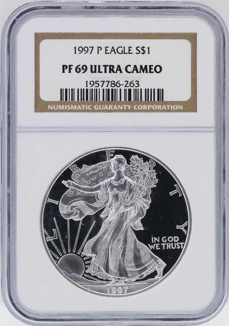 One American Silver Eagle Dollar Coin Set (lot of 2) featuring: 1997 NGC MS69 American Silver Eagle Dollar and 1997-P NGC PF69 Ultra Cameo American Silver Eagle Dollar. NGC Certified.