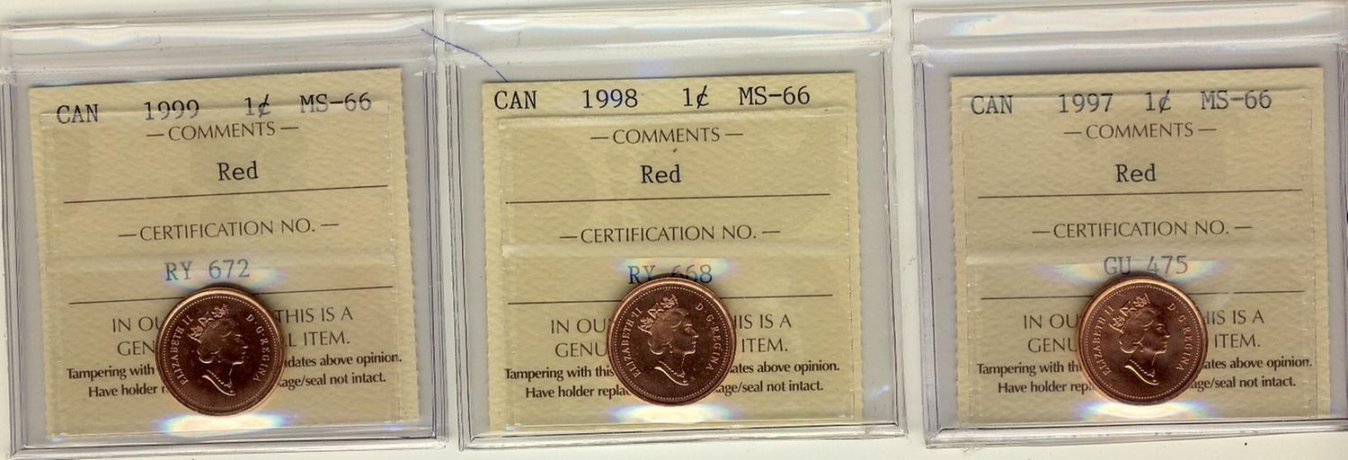 1997,1998,1999 1¢ ICCS MS66 Red, Lot of 3 coins,