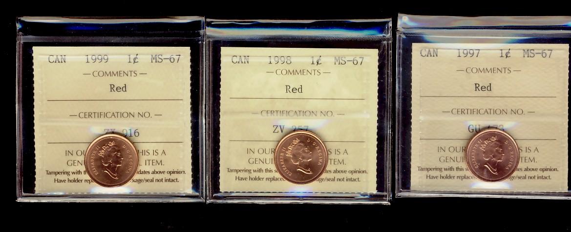 1997, 1998 & 1999 1¢ ICCS MS67RD. Lot of 3 coins.