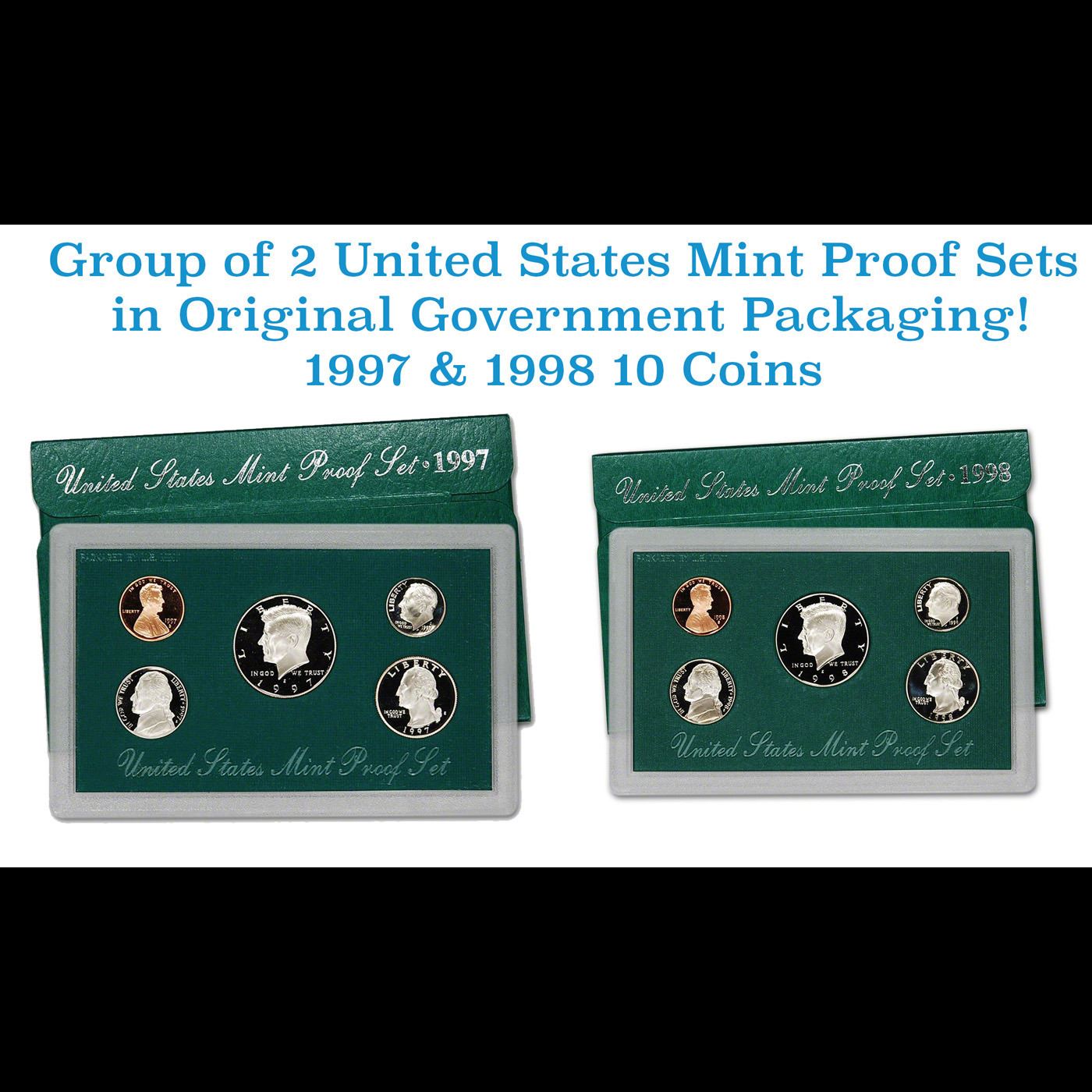 1997-1998 United States Mint Proof Set. 10 Coins Inside.. Group of 2 United States Proof Sets 1997-1998 10 coins. All coins included in the set were struck at the San Francisco Mint. Each set contains a Half Dollar, a Quarter, a Dime, a Jefferson Nickel and a Lincoln penny. Harder Set. The packaging for the 1997-1998 Proof Set was themed in green. The coins were placed in individual spaces in a green cardboard. This was sealed within a plastic lens. The outer box was green and had silver printing “United States Mint Proof Set 199_”.