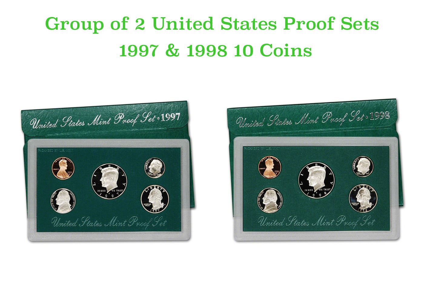 1997-1998 United States Mint Proof Set. 10 Coins Inside.. Group of 2 United States Proof Sets 1997-1998 10 coins. All coins included in the set were struck at the San Francisco Mint. Each set contains a Half Dollar, a Quarter, a Dime, a Jefferson Nickel and a Lincoln penny. Harder Set. The packaging for the 1997-1998 Proof Set was themed in green. The coins were placed in individual spaces in a green cardboard. This was sealed within a plastic lens. The outer box was green and had silver printing “United States Mint Proof Set 199_”.