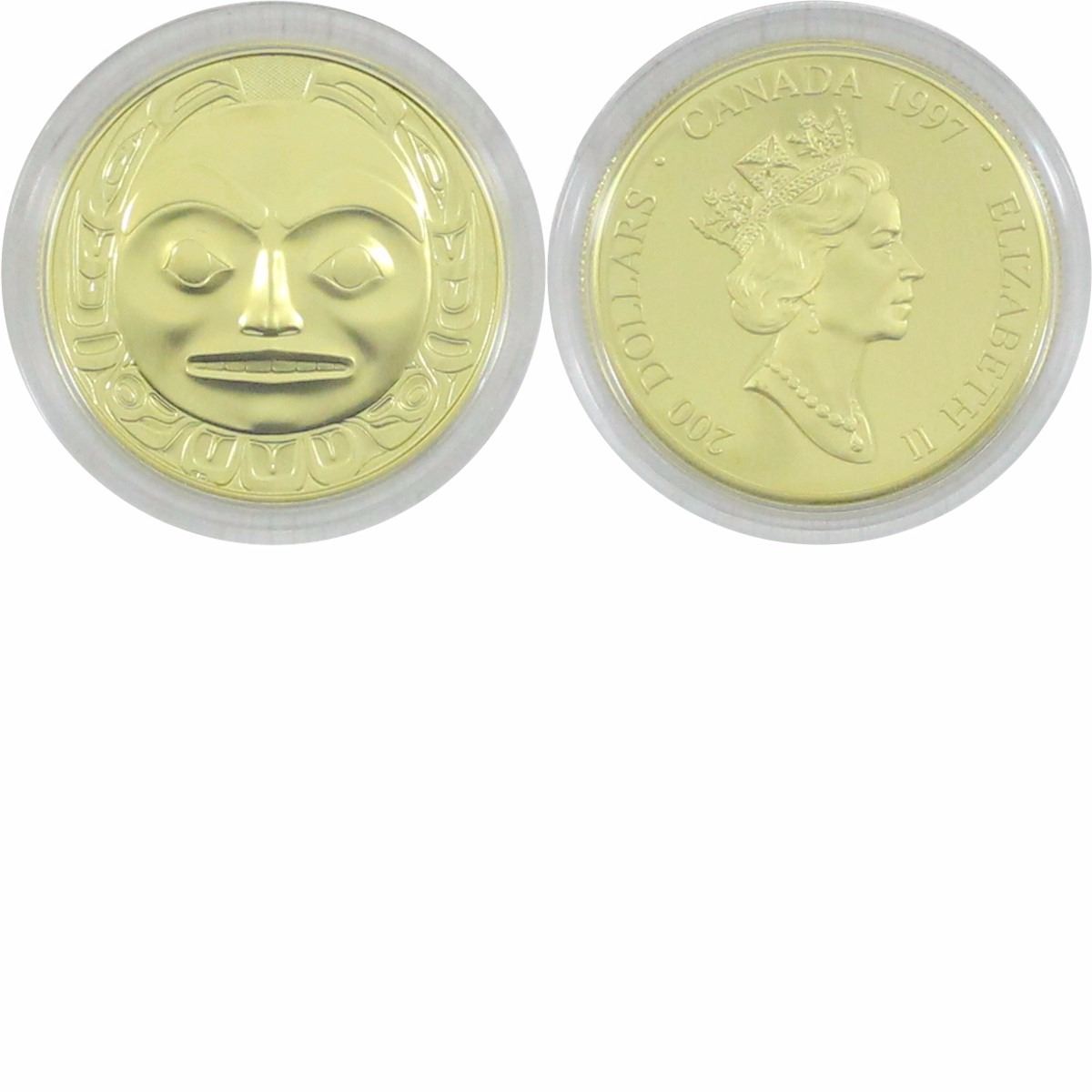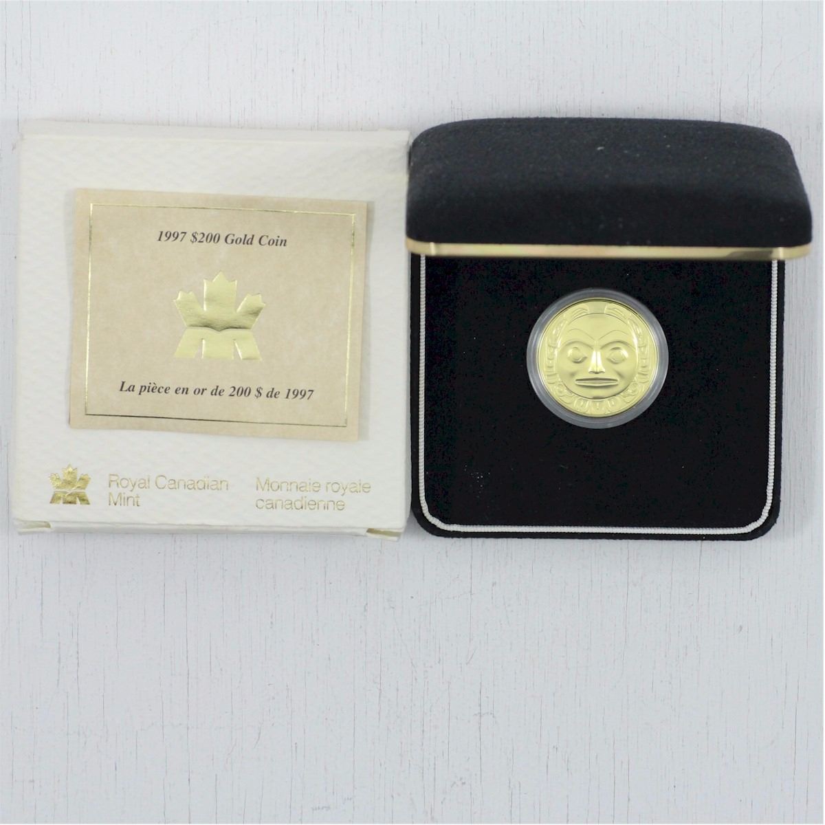 1997 $200 22 karat Haida Raven Bringing Light to the World Gold Coin. This coin weighs 17.13 grams and contains .50 troy oz of pure Gold. Comes with all original Mint packaging. Buyers Premium will be added on all items as per our terms of sale. We accept Paypal, Credit Card, E-Transfer Payments, Cheque or Money Orders (there is an additional 3% fee for using Paypal or Credit Card). All invoices will be emailed immediately following the auction, please contact us if you would like to pay by credit card or receive a new revised lower total for mailing in payment or sending an e-transfer (3% discount). All Items Are Sold "AS IS", no returns