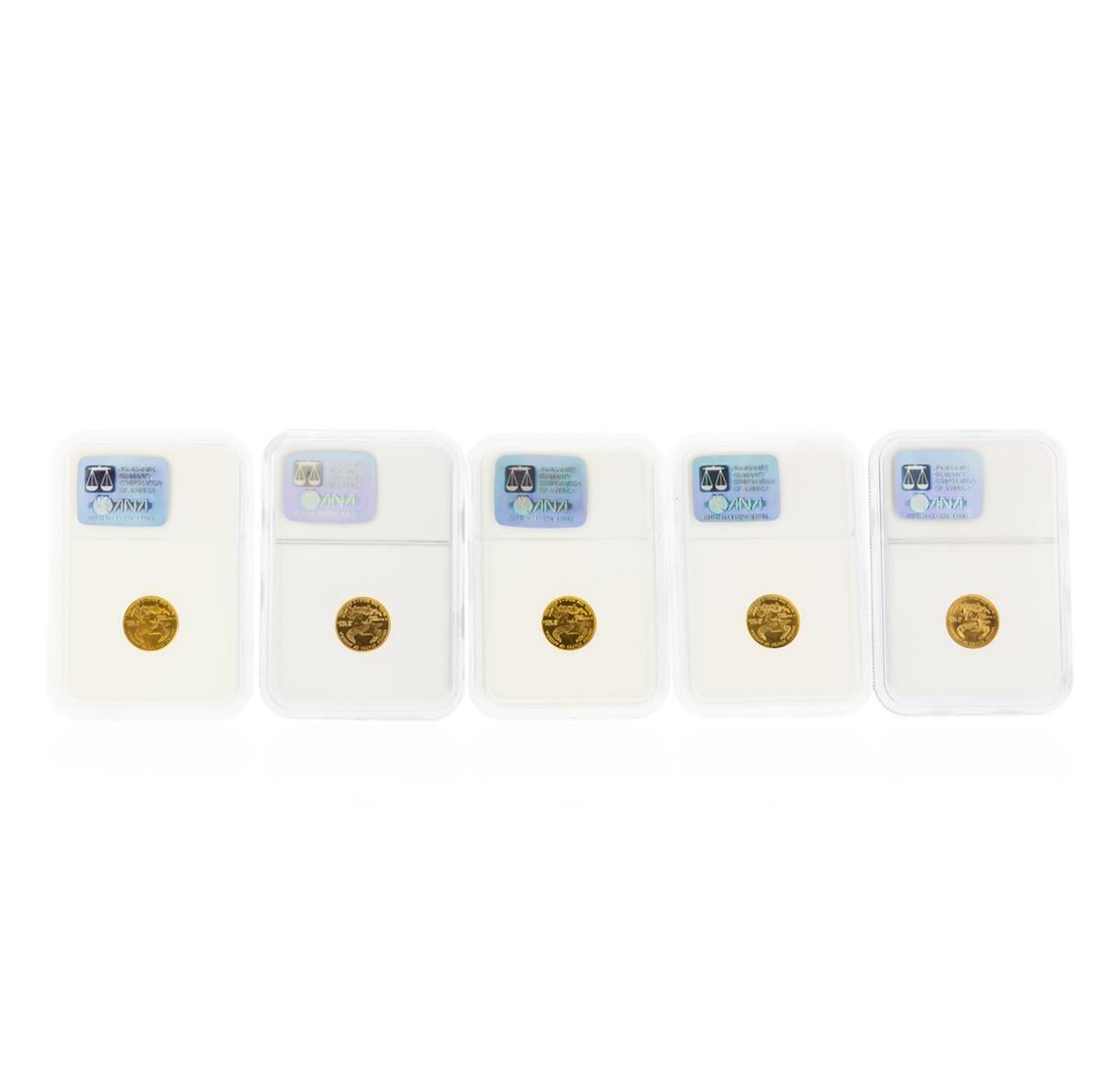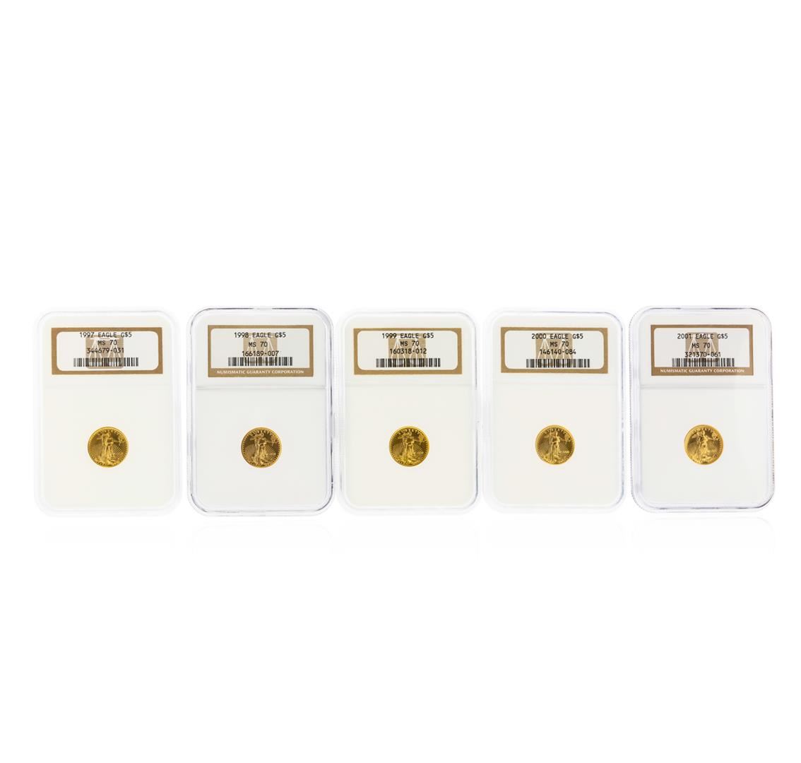 One 1997-2001 $5 1/10 oz. American Eagle Gold Coin NGC MS70. NGC Certified.