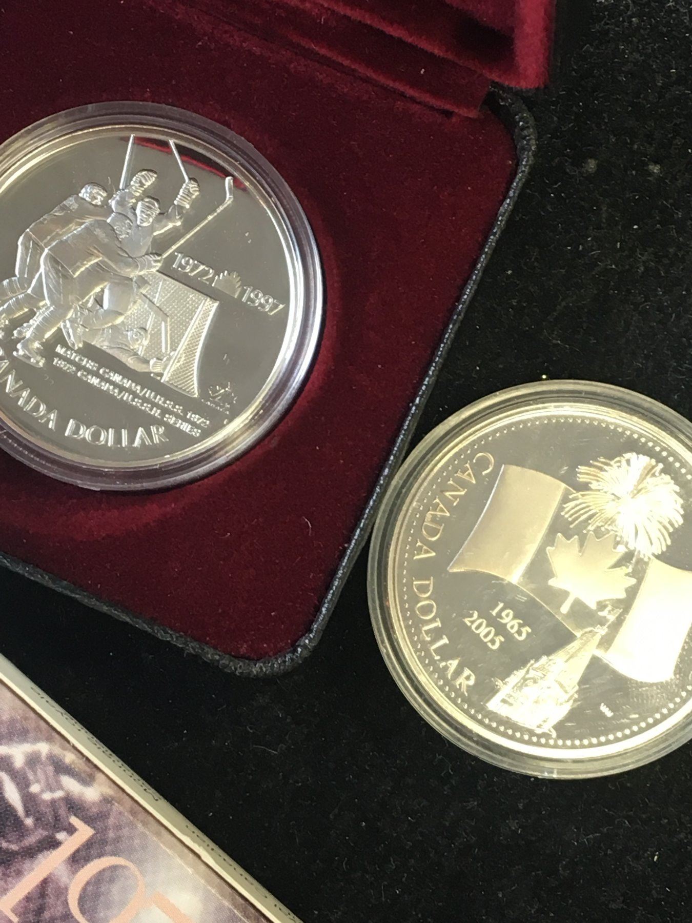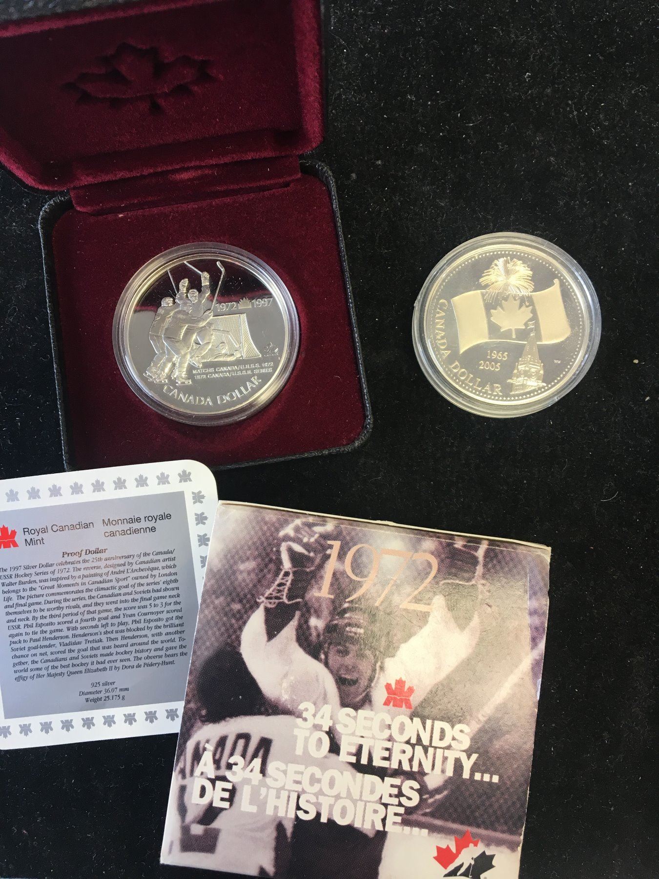 NICE LOT OF 2 CANADA PROOF SILVER DOLLARS.2005 HAS NO CASE.