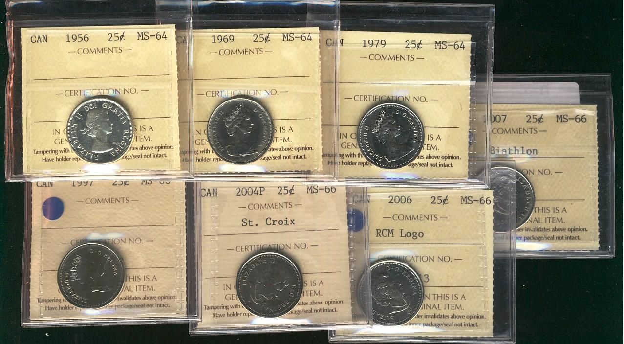 1997 25¢, 2004P St. Croix, 2006 RCM Logo & 2007 Biathlon ICCS MS66. Along with 1956 25¢, 1969 & 1979 MS64. Lot of 7 ICCS coins.