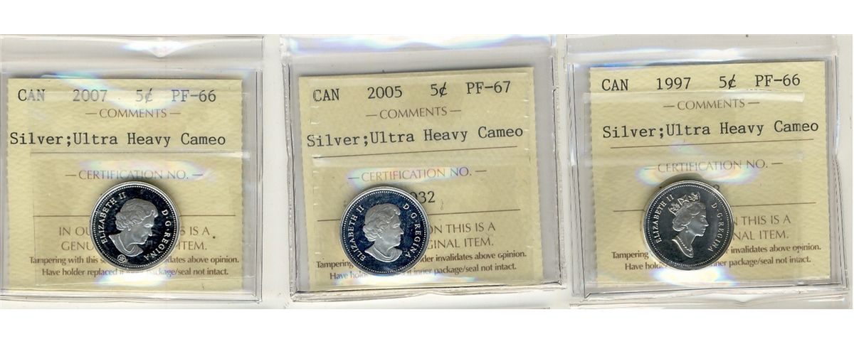 1997 5 Cents , 2007 PF66, 2005 PF67; Three ICCS coins Ultra Heavy Cameo.