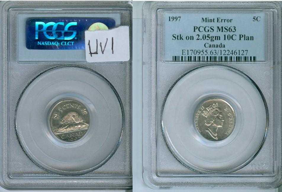 1997 5¢ ERROR PCGS MS63. Five cent coin struck on 2.05gm 10¢ Planchet. A Must see