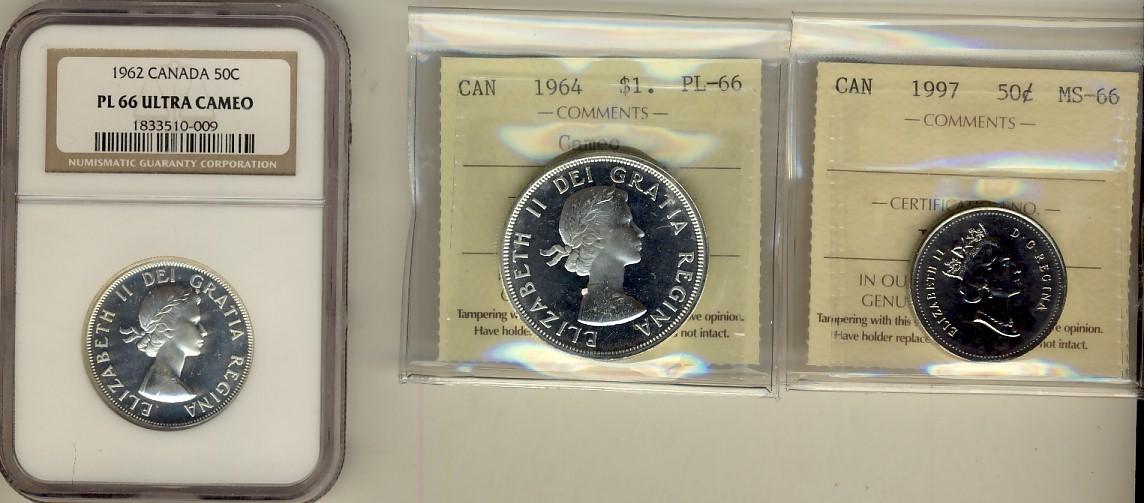 1997 50¢ MS66, 1964 $1 PL66 Cameo & 1962 50¢ PL66 UHC. Lot of 3 graded coins.