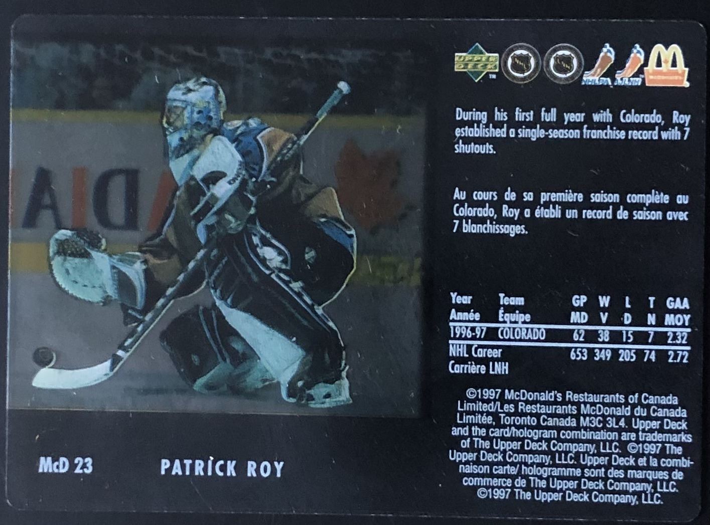 McDonald's card #McD23 NHL, hockey, UD, hall of fame, regional