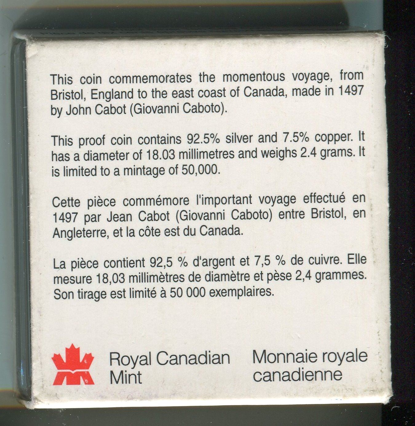 1997 CNDN 500TH JOHN CABOT VOYAGE ANNIVERSARY SILVER DIME
