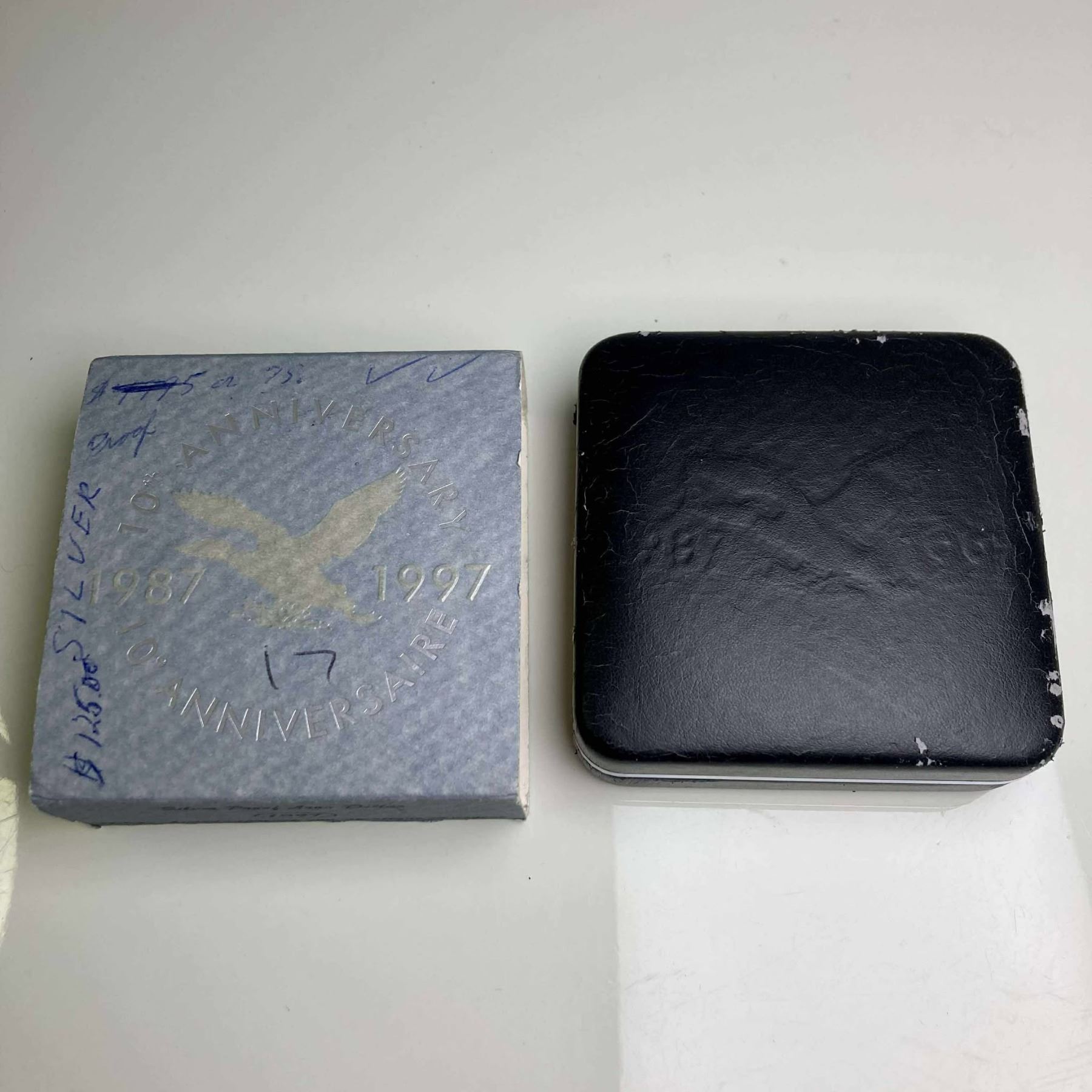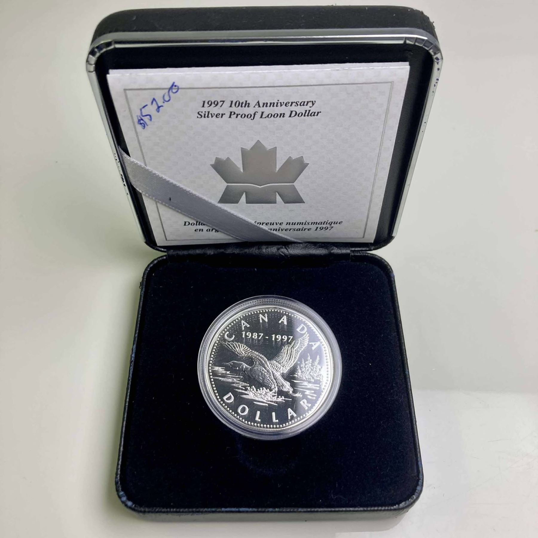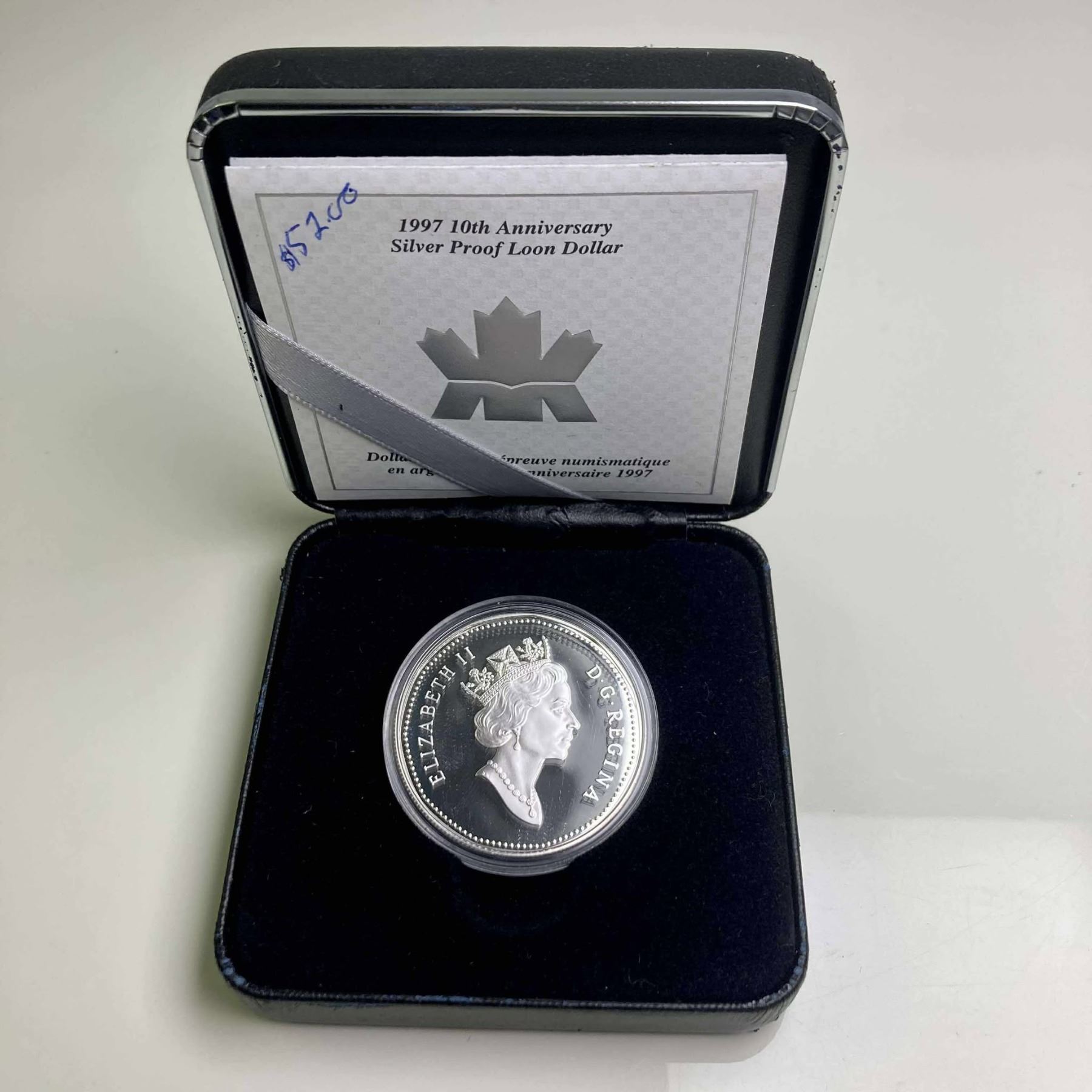 10th Anniversary of the Loon Dollar. Sterling silver coin. Case shows wear/writing.