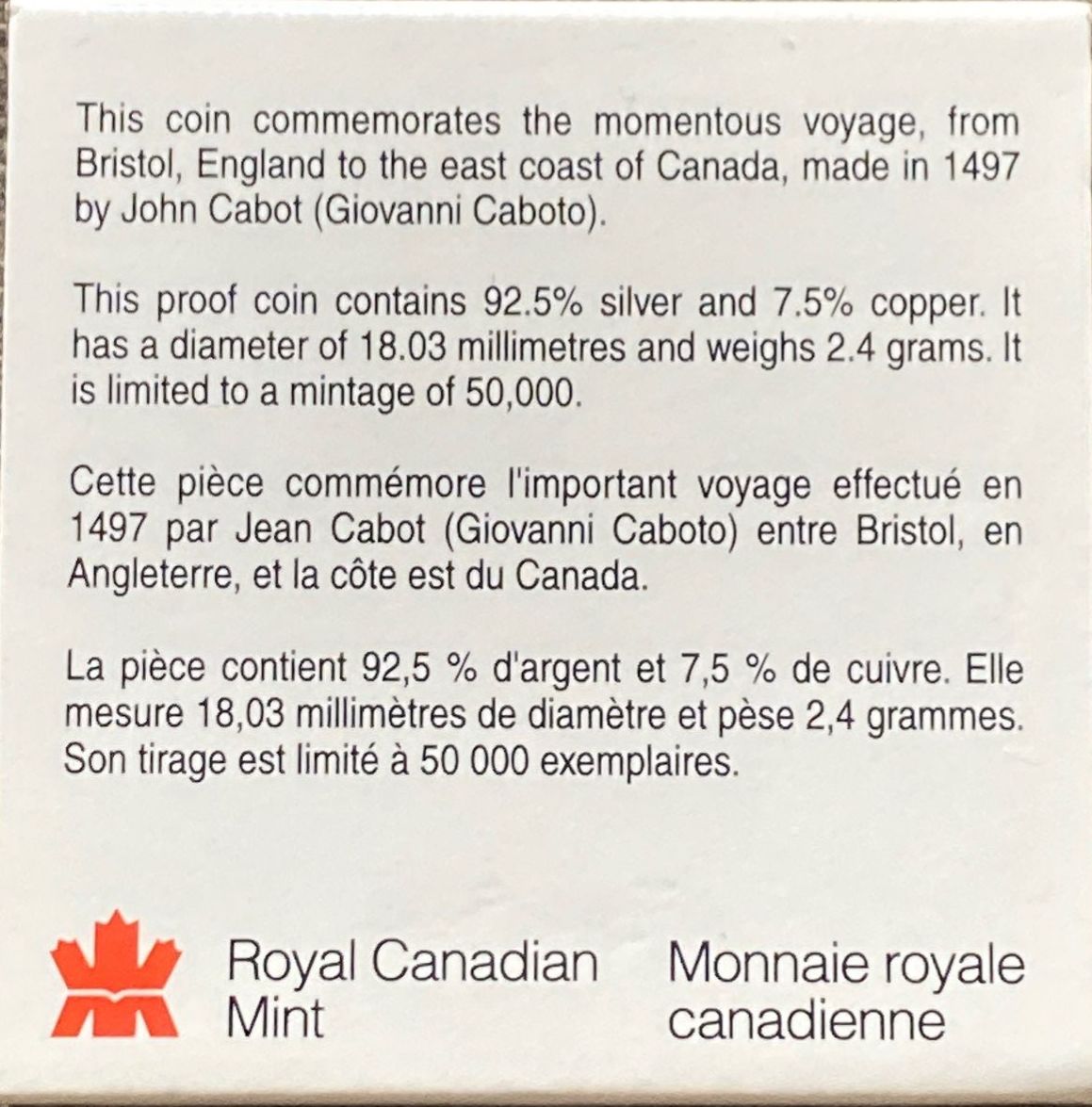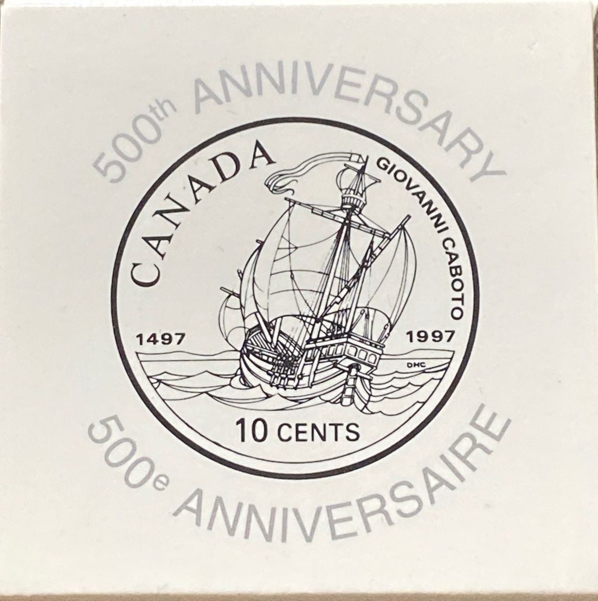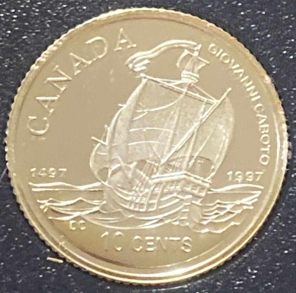 1997 Canadian 10-cent coin, which features a commemorative design depicting the ship of John Cabot (Giovanni Caboto) to mark the 500th anniversary of his arrival in North America