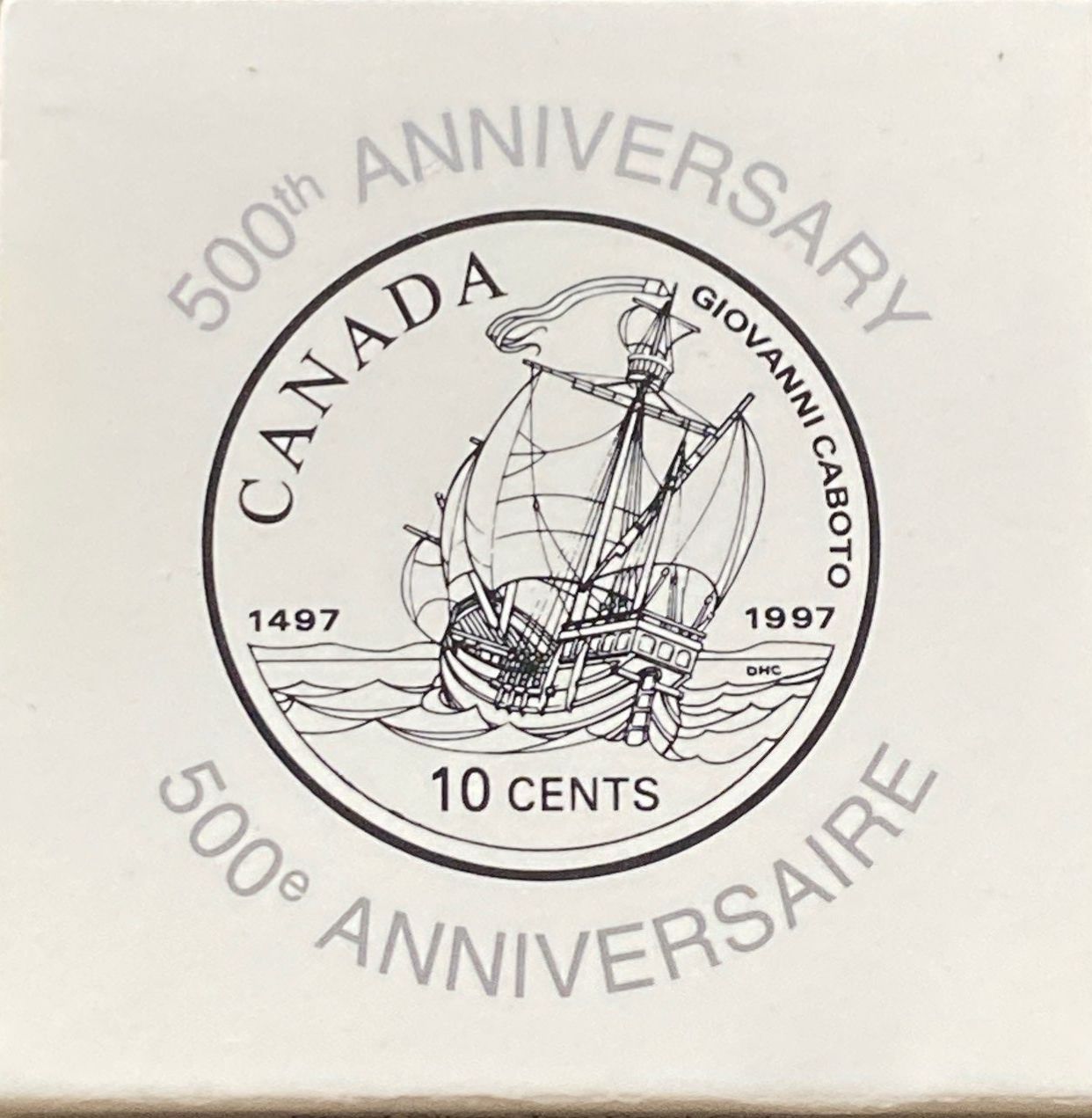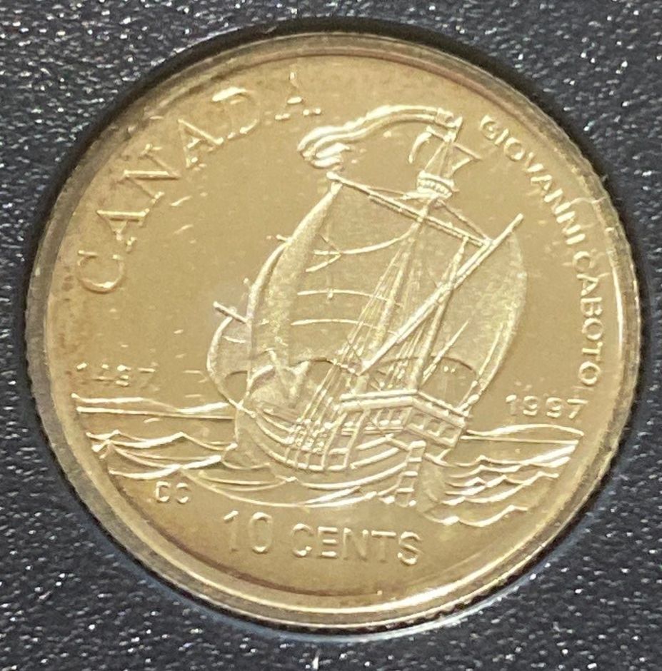 1997 Canadian 10-cent coin, which features a commemorative design depicting the ship of John Cabot (Giovanni Caboto) to mark the 500th anniversary of his arrival in North America