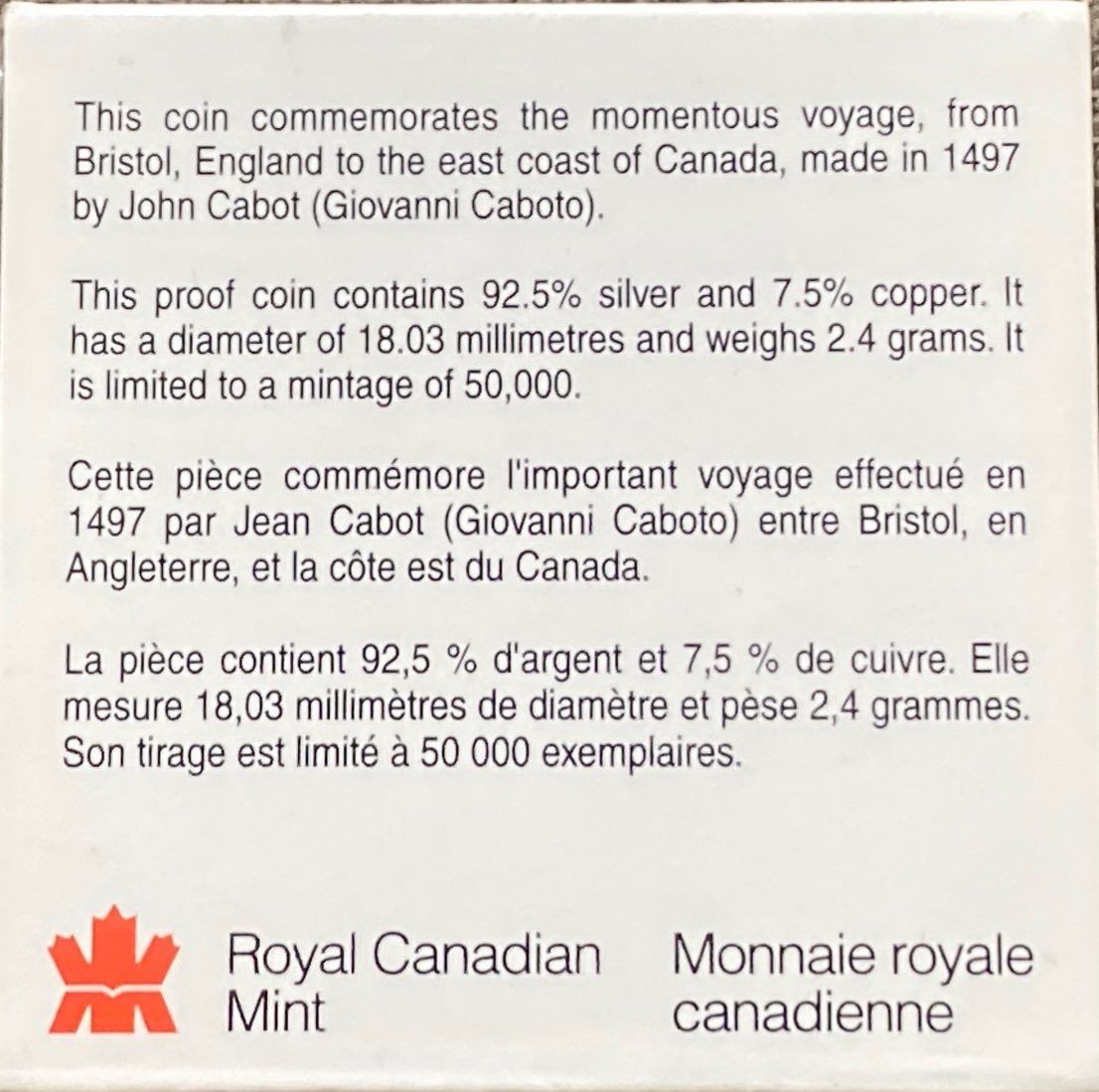 1997 Canadian 10-cent coin, which features a commemorative design depicting the ship of John Cabot (Giovanni Caboto) to mark the 500th anniversary of his arrival in North America