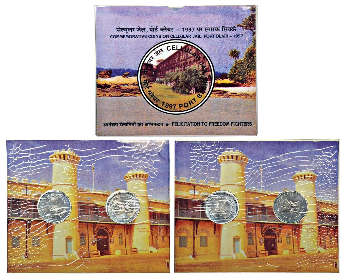 1997, Cellular Jail Port Blair, Special UNC collector's pack of 2 coins, 1 rupee (2 coins), Calcutta mint, Andaman-Nicobar administration felicitation to freedom fighter, RB 202, in original mint packing.