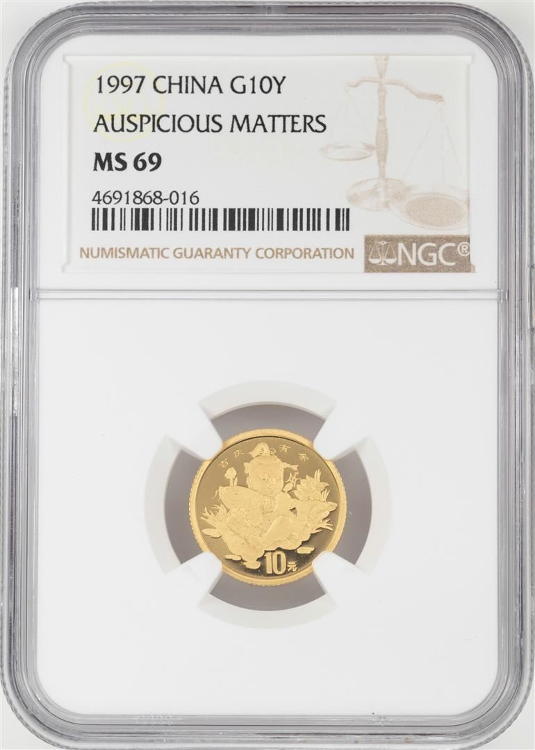 One 1997 China 10 Yuan Auspicious Matters Gold Coin NGC MS69. NGC Certified.