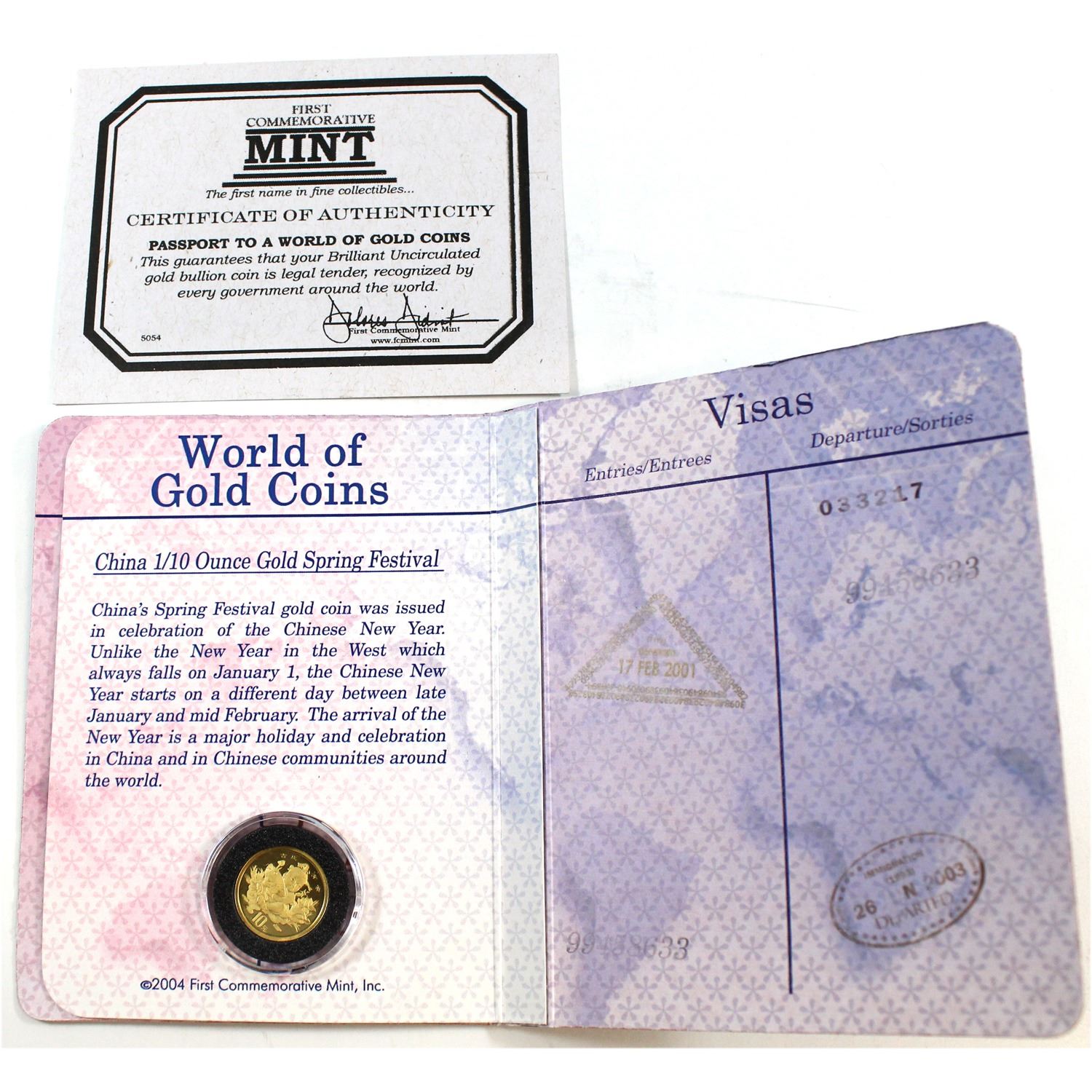 1997 China 10Y 1/10oz Fine Gold Spring Festival (Tax Exempt). Comes encapsulated in a World of Gold Coins Passport with COA.