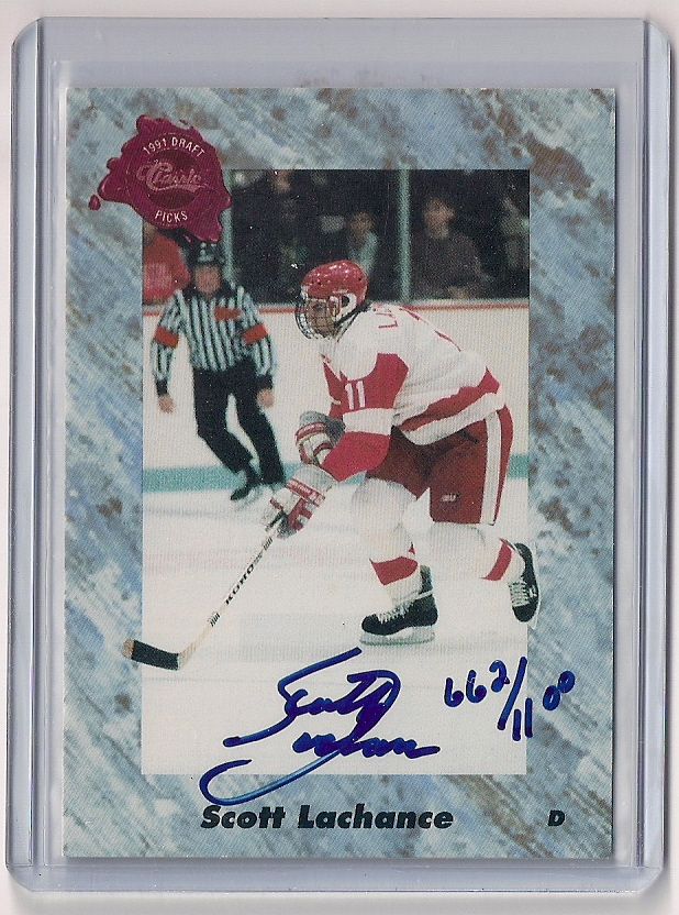 1997 Classic Draft Picks Scott Lachance Autographed Rookie Card. This Rookie Card is signed in Blue Sharpee on the front of the card, and serial numbered 662/1100! Card is Near Mint.