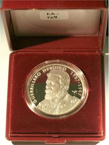 Commemorative proof 1 oz .999 fine silver 10 Peso coin with ultra heavy cameo. Issued for the 25th Anniversary of the death of Ernesto Che Guevara. In original red case of issue (no return).