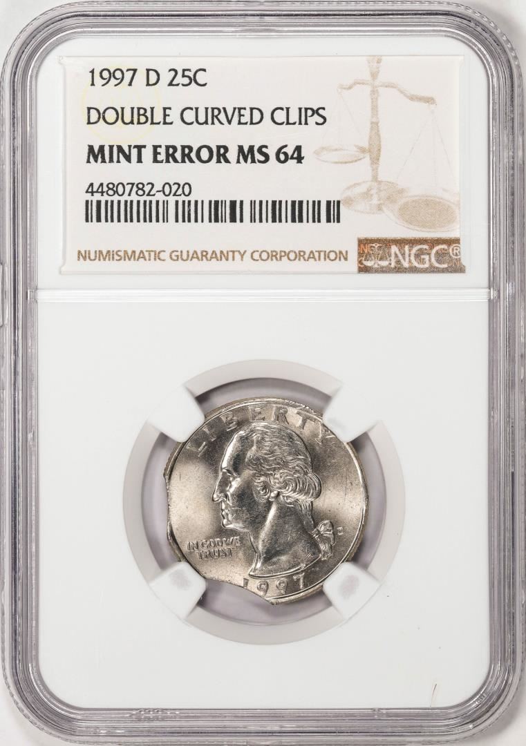 One 1997-D Washington Quarter Coin Double Curved Clips NGC Mint Error MS64. NGC Certified.