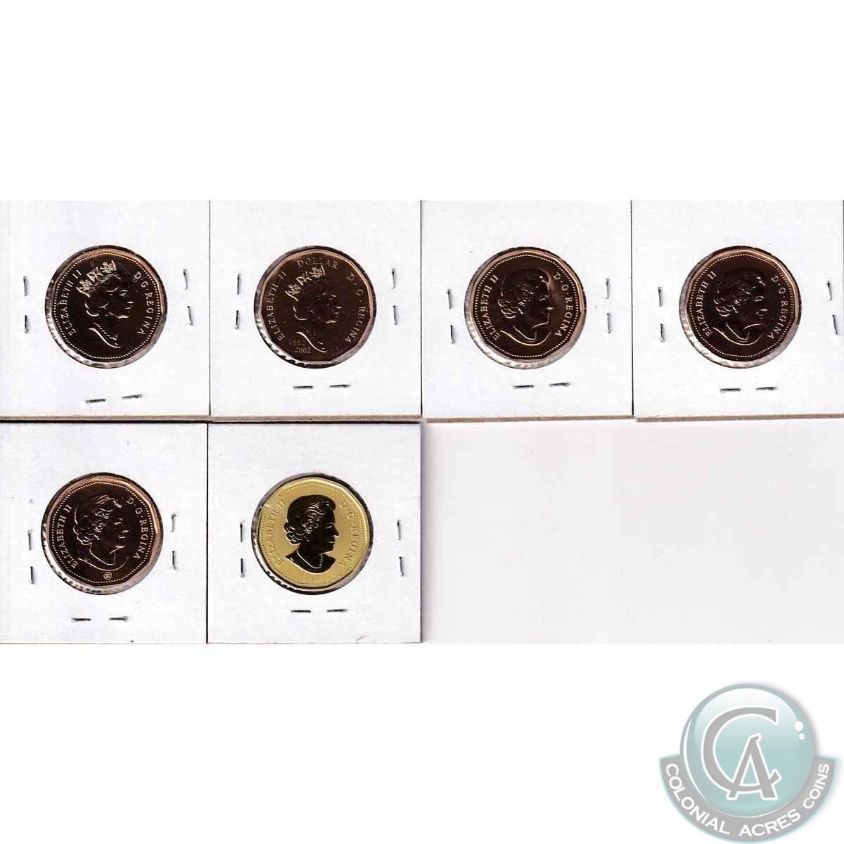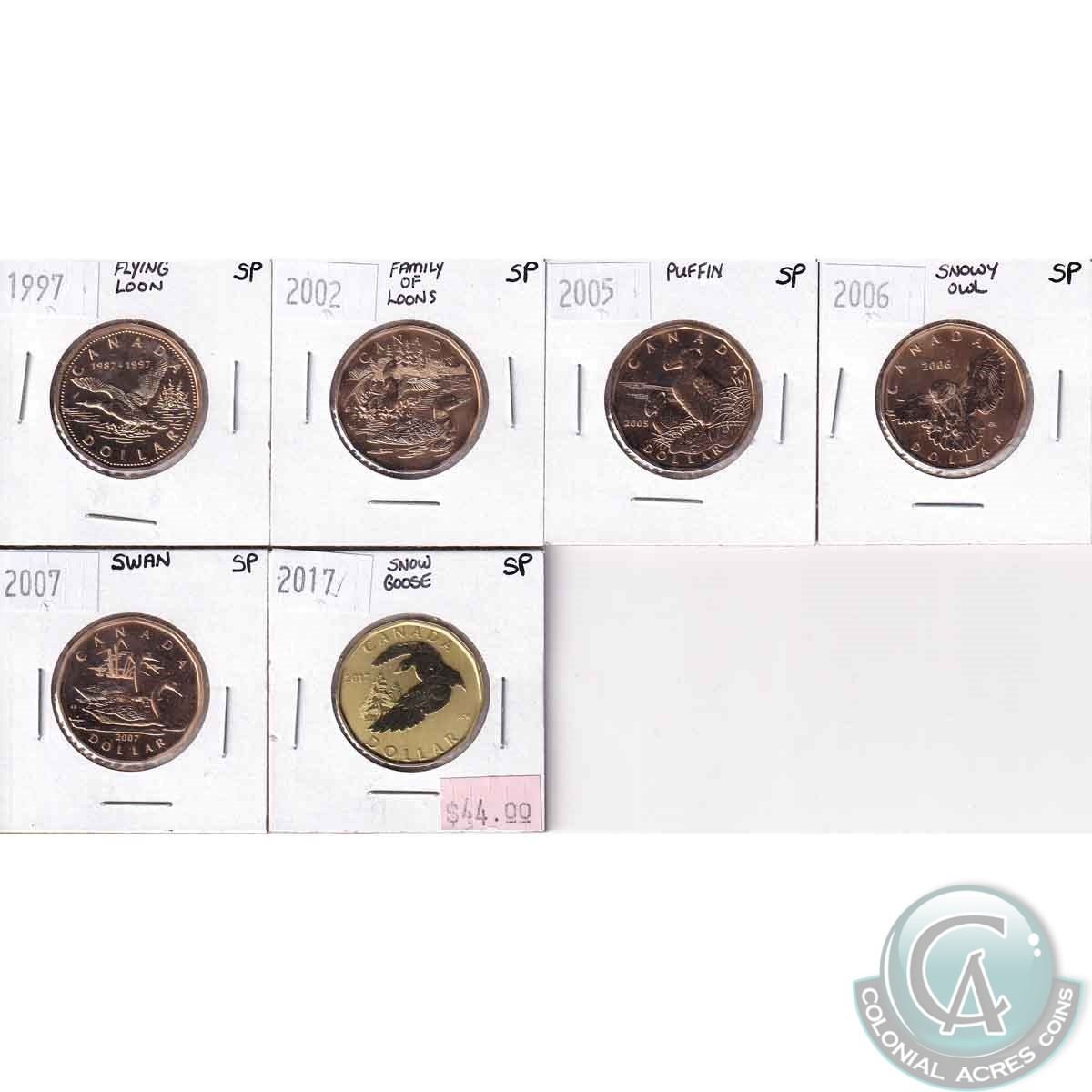 1997 Flying Loon, 2002 Family of Loon, 2005 Puffin, 2006 Snowy Owl, 2007 Swan & 2017 Snow Goose Canada Commemorative Loon Dollars in Specimen condition. 6pcs