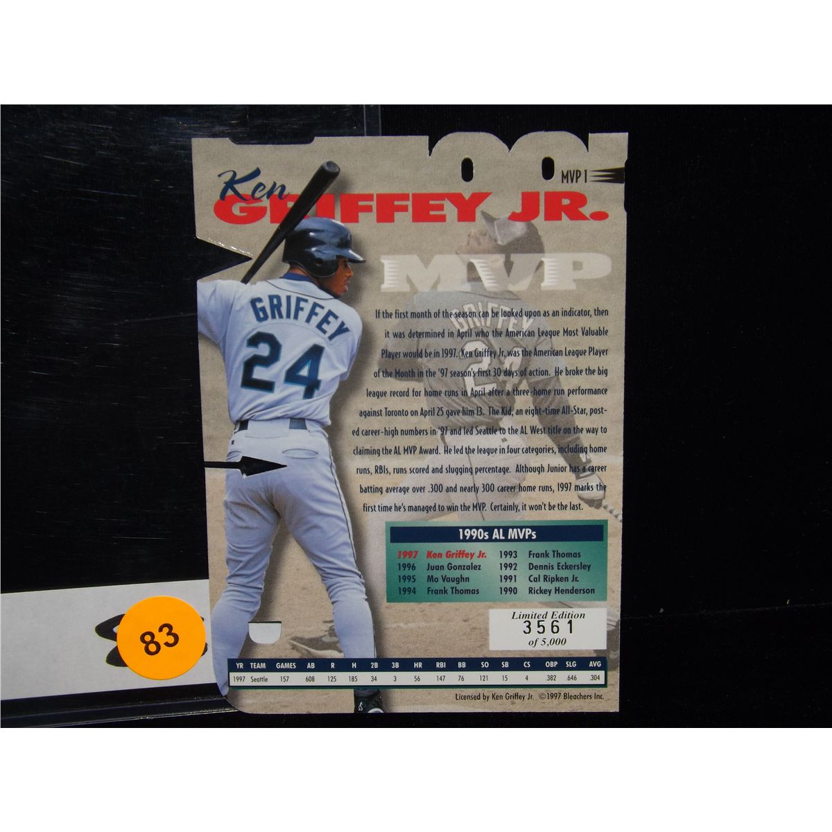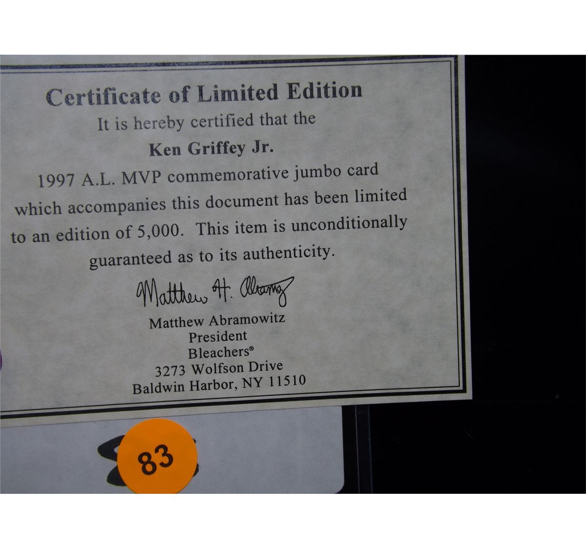 1997 Griffey Jr. Trading Card. 4x6 Commemorative trading card. Appraised or estimated retail value $200. COA by Bleachers. All Sales Final. Please see terms and conditions of auction.