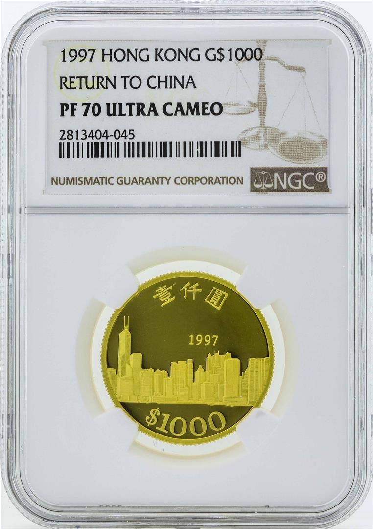 One 1997 Hong Kong $1000 Return to China Gold Proof Coin NGC PF70 Ultra Cameo. NGC Certified.