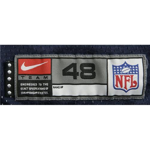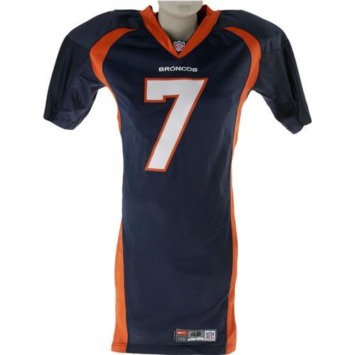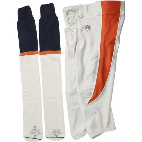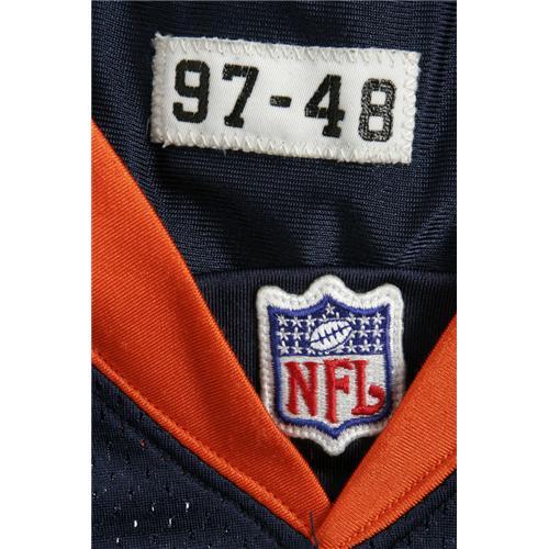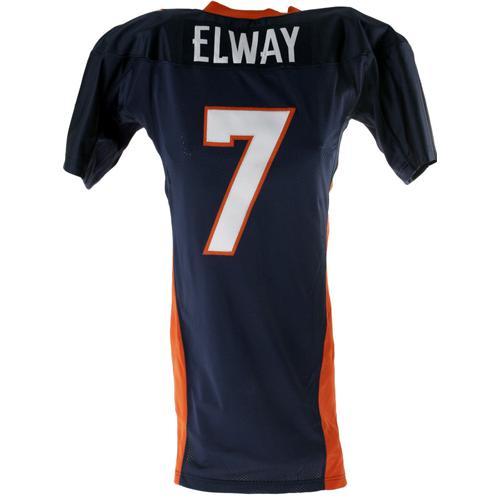 <B>1997 John Elway Game Worn Uniform.</B></I> Like the Brooklyn Dodgers in 1955, the Boston Red Sox in 2004, and the Chicago White Sox in 2005, the year 1997 finally ended the suffering for a Denver Broncos team that was often the bridesmaid but never the bride. The legendary Hall of Fame quarterback proved that the fourth Super Bowl was the charm, as he led the Broncos to the promised land with a thirty-one to twenty-four victory over the Green Bay Packers in Super Bowl XXXII. And so, while any uniform from this iconic quarterback's career is worthy of the greatest admiration, this home navy mesh jersey, complete with matching pants and socks, is a definite cut above. The navy mesh and dazzle cloth home jersey presents white and orange tackle twill number "7" on front, back and shoulders, with "Elway" sewn in proper white tackle twill font to rear nameplate. "97-48" embroidered swatch is affixed to interior collar, with "Nike size 48" label present in tail. The neck swatch appears to have been re-stitched and may have been lifted from another jersey during the manufacturing process. The matching pants continue the orange side-striping theme of the jersey, and finds hand-markered number "7" placed on either side of the laced fly. Tagging here denotes "Nike, NFL ProLine" with flap tags reading, "38" and "Short" with washing instructions. Year swatch is stamped "97." Finally we come to the socks, which feature a number "7" in marker at each toe. All pieces show evidence of light wear. <I>LOA from Lou Lampson.</B></I><BR><BR><b>Shipping:</b> Clothing, Costumes & Jerseys (<a target="_blank" href="http://www.heritageauctions.com/common/shipping.php">view shipping information</a>)